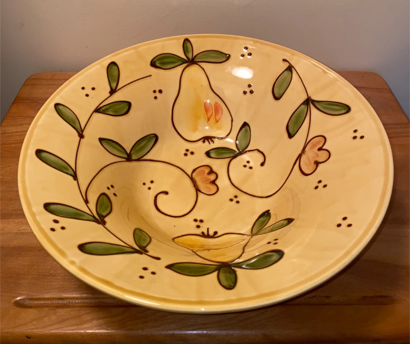 Selling a lovely bowl with a pear and floral design! It's large, 16-in in diameter. Perfect for adding a touch of charm in your kitchen or dining room.