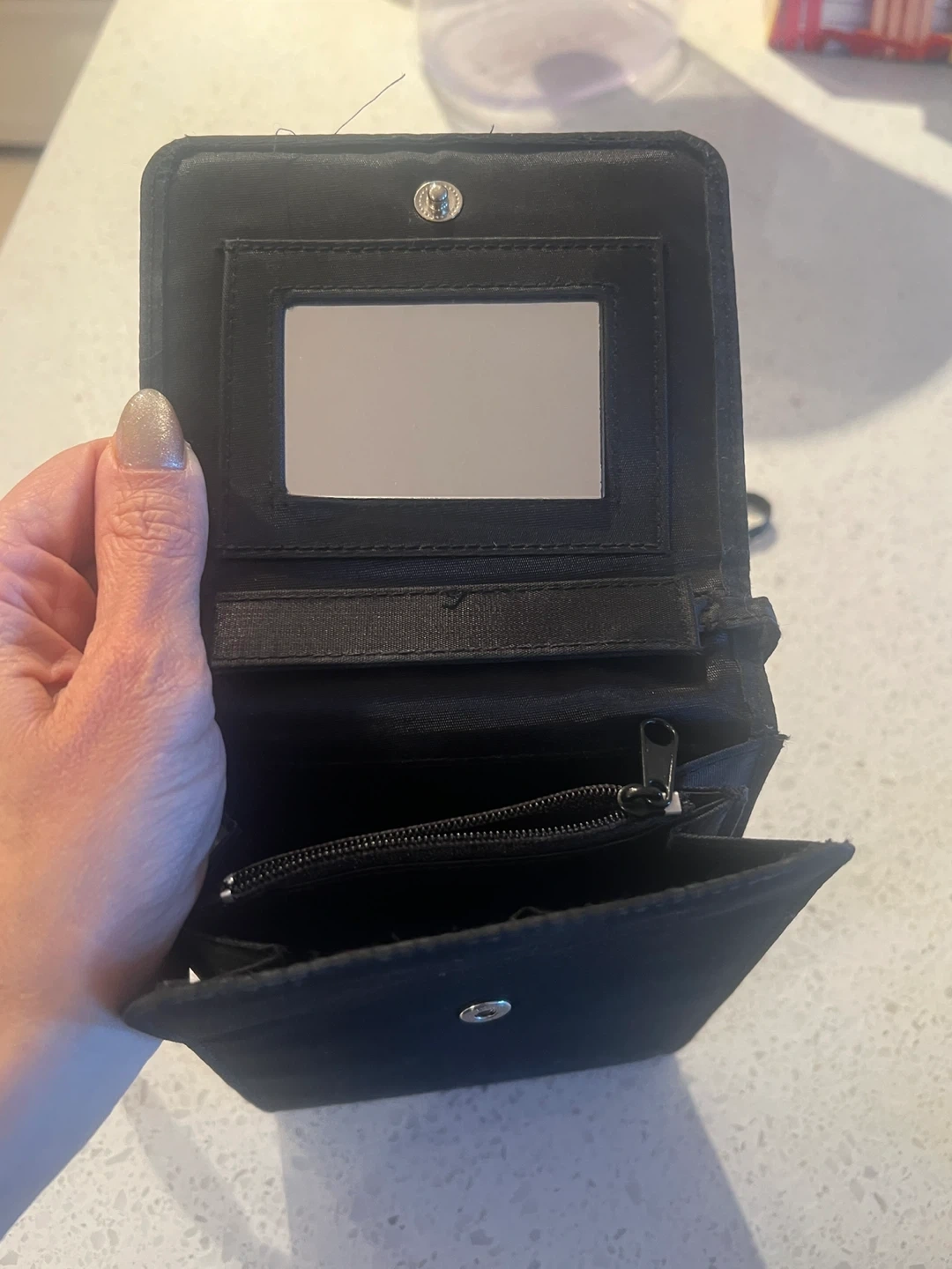 15This is a cute little black crossbody bag! It's perfect for carrying your essentials when you don't want to lug around a big purse. It has a small mirror inside, which is very convenient. It's in great condition and ready for a new home