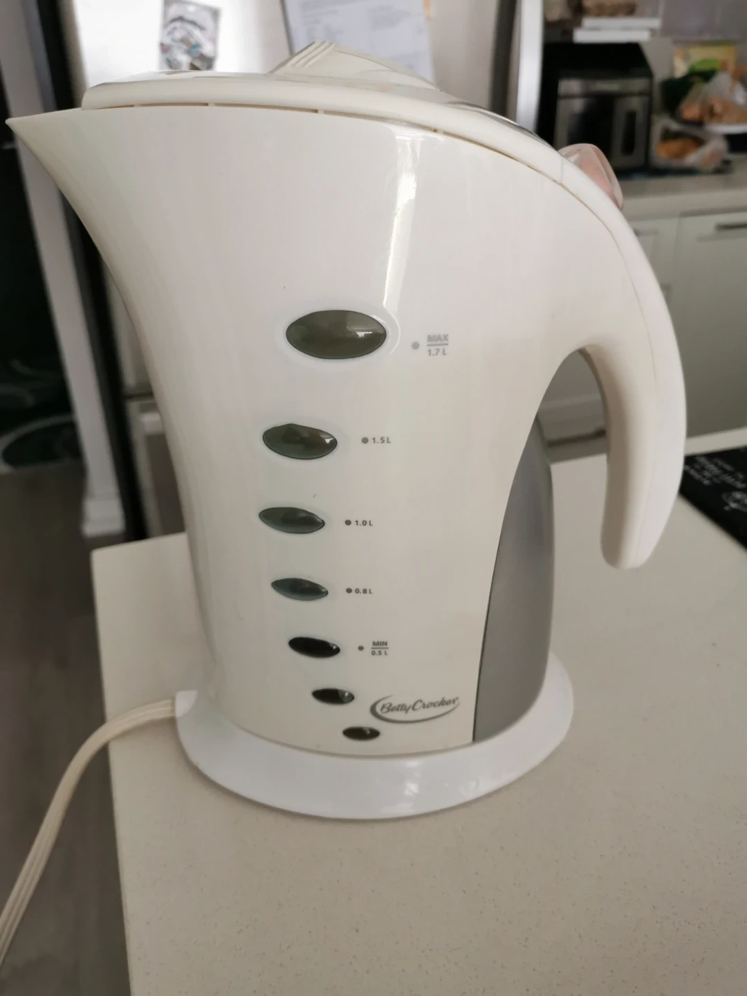 Selling a Betty Crocker electric kettle. It has a 1.7L capacity and markings for different water levels. Perfect for making tea or coffee!