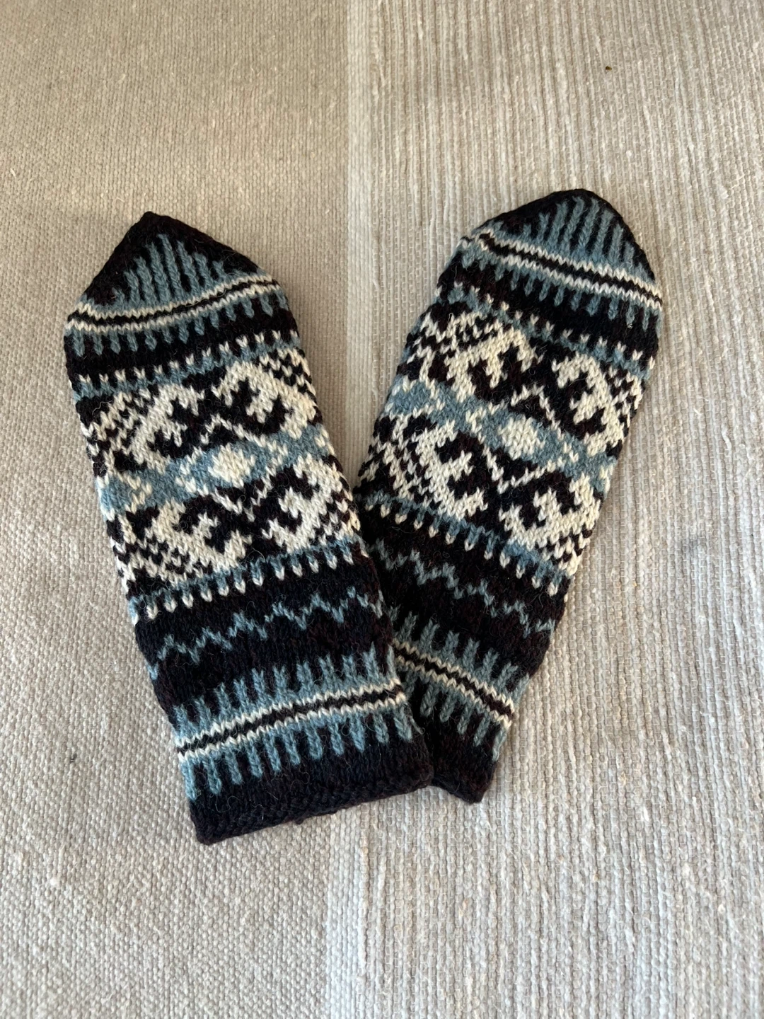 Selling a pair of cozy, handmade wool mittens! They feature a beautiful blue and black pattern. Perfect for keeping your hands warm this winter! Unique gift for the holidays!