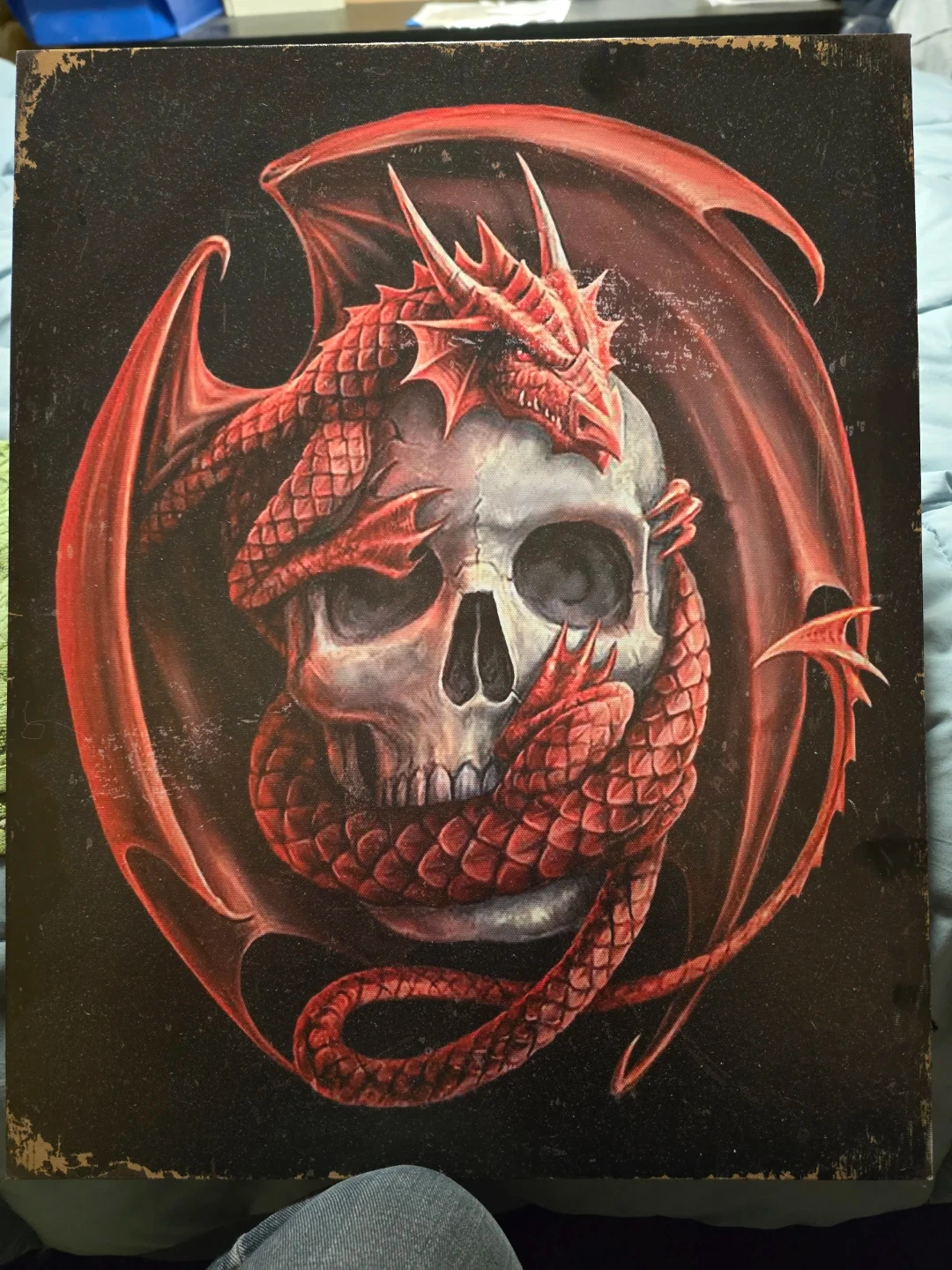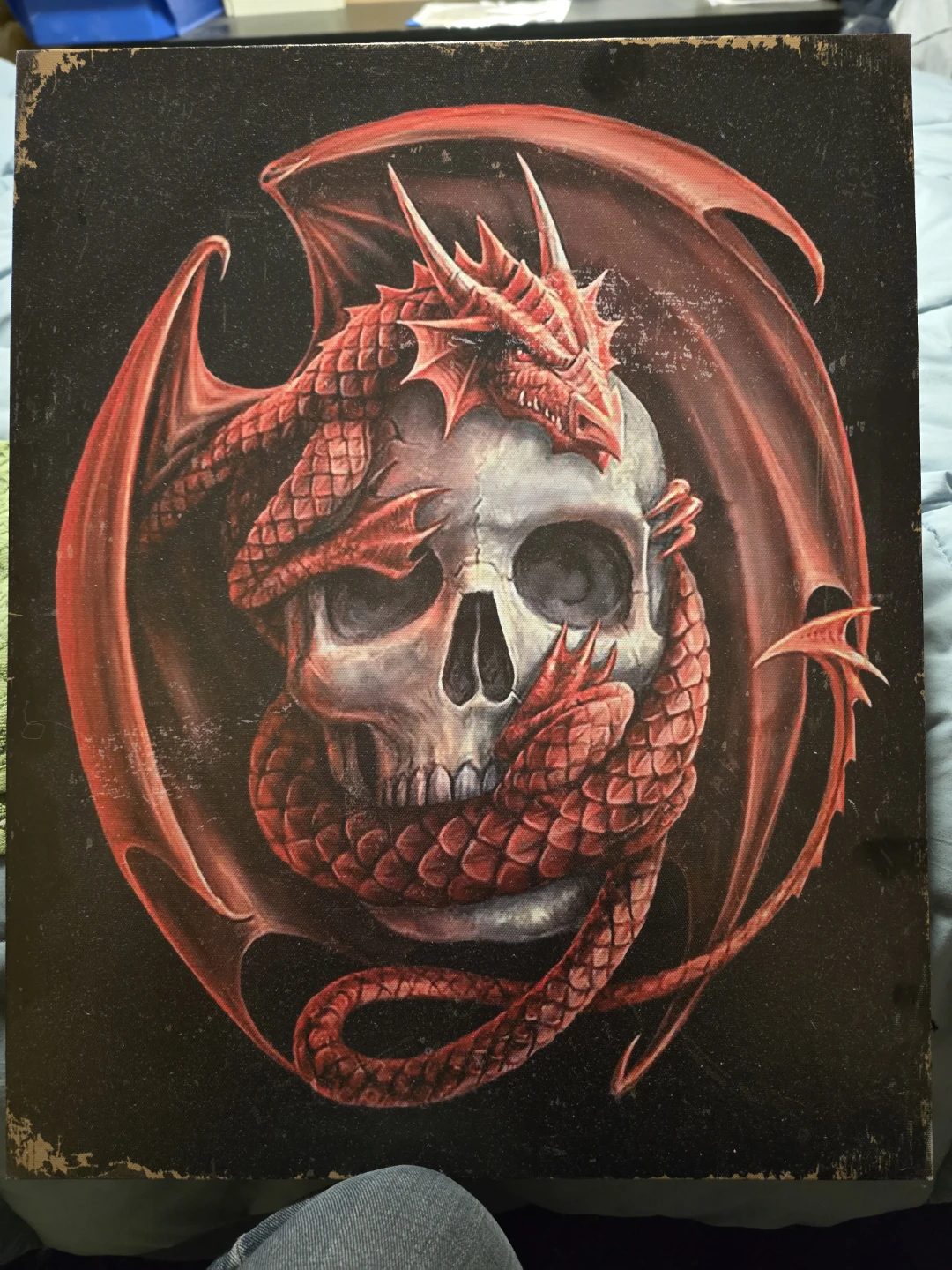 Cool wall art featuring a red dragon and skull design! It has a unique, eye-catching look. There are some signs of wear and tear on the corners. 16"×20"