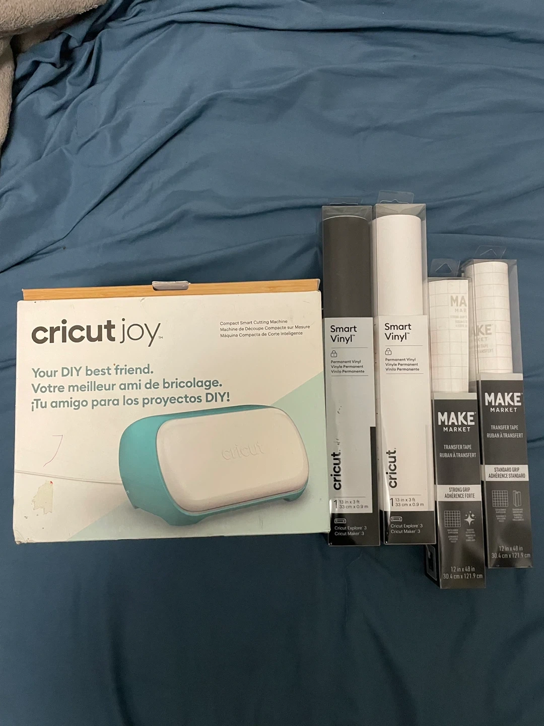 10Selling a Cricut Joy machine along with a bundle of vinyl! The vinyl includes: - Cricut Smart Vinyl (Permanent Vinyl) 13 in x 3 ft (Black) - Cricut Smart Vinyl (Permanent Vinyl) 13 in x 3 ft (White) - Make Market Transfer Tape (Strong Grip) 12 in x 48 in - Make Market Transfer Tape (Standard Grip) 12 in x 48 in Bought but not used due to not knowing how to use