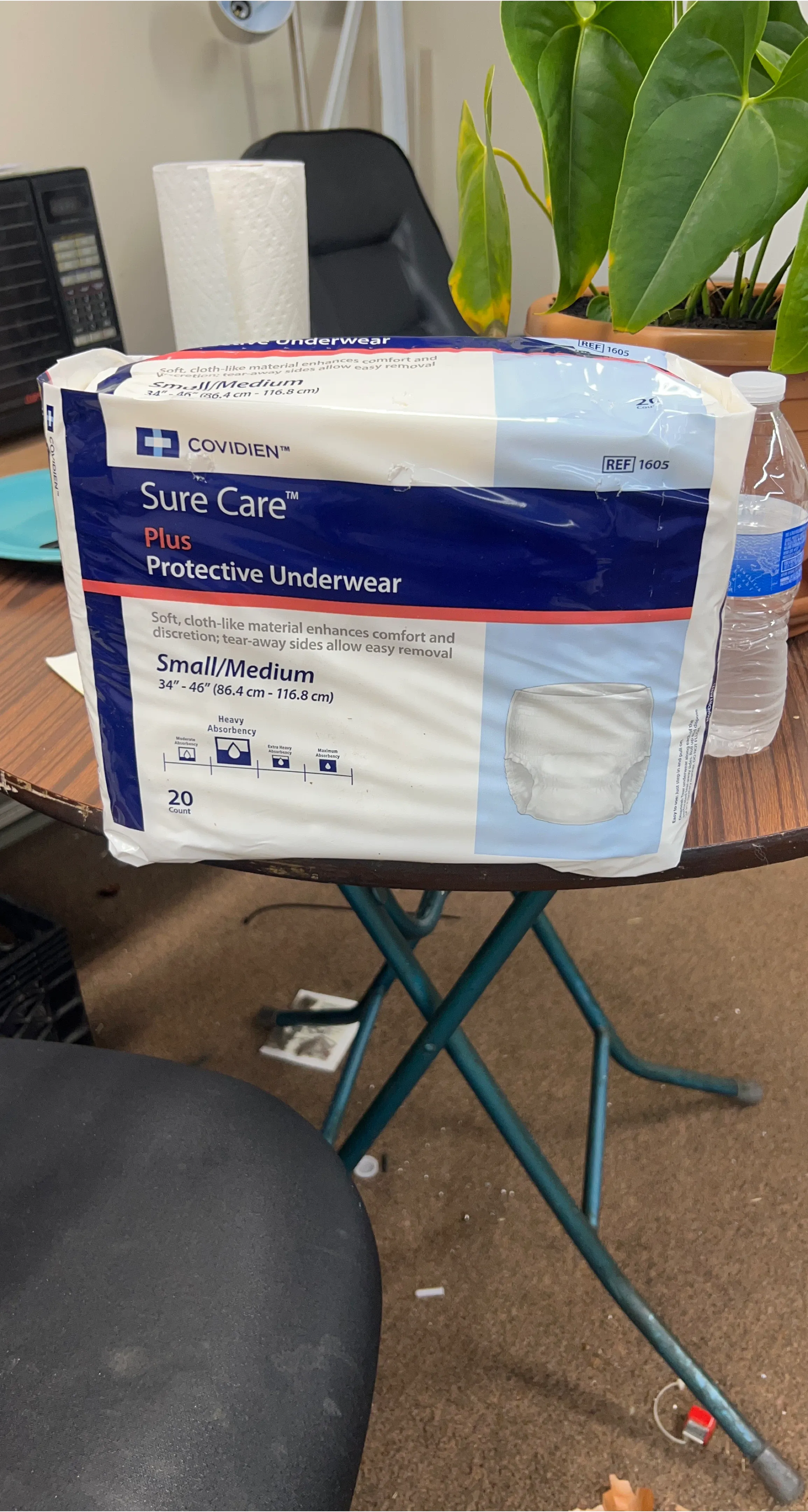 Selling Covidien Sure Care Plus Protective Underwear, size Small/Medium (34"-46" or 86.4 cm - 116.8 cm). They are designed with a soft, cloth-like material to enhance comfort and discretion, and have tear-away sides for easy removal. Each pack contains 20 count.