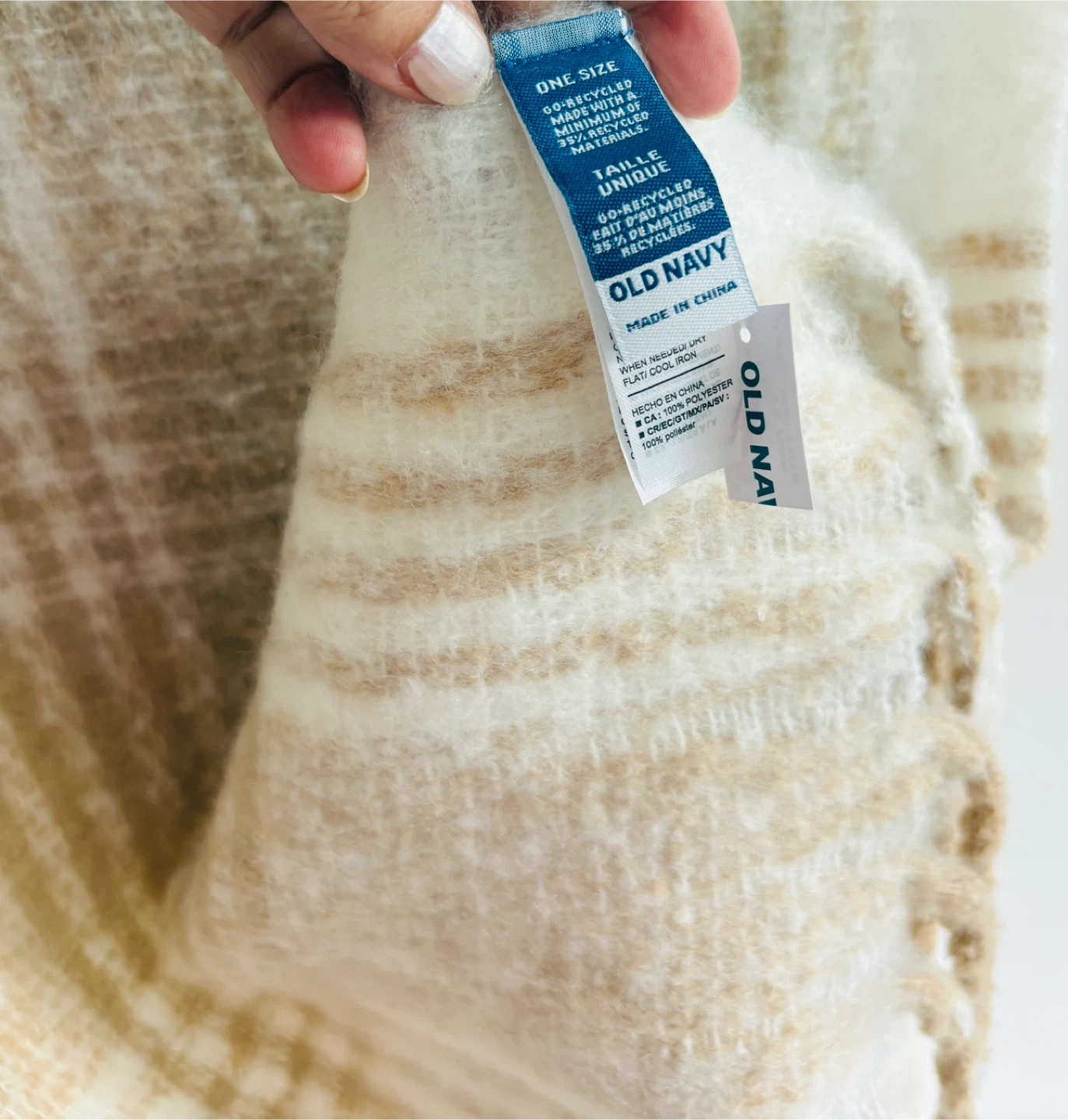 244Cozy Old Navy scarf in a neutral plaid pattern! It's a one-size-fits-all and made of 100% polyester. Perfect for staying warm this season.