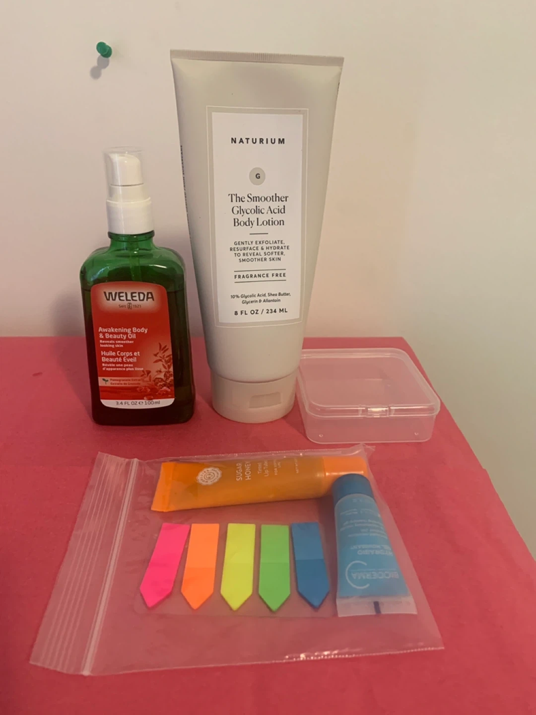 752Message with a day & timeframe of Pickup •Collection at 30 Okra Tomar Crescent Naturium Body Lotion( Like New) Body Oil w/pomegranate & Davana Bioderma sample Tinted Lip balm Arrow note sheet Storage box Take everything! Bag provided