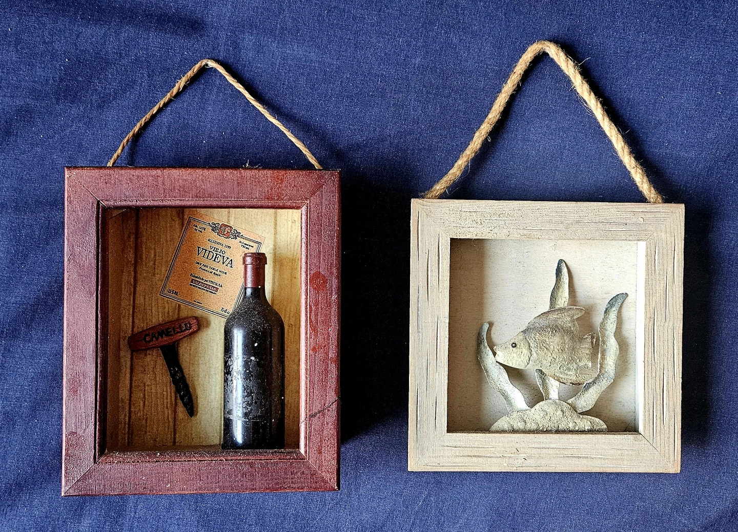 Cute framed fish & wine wall decor with a rustic, beachy vibe!