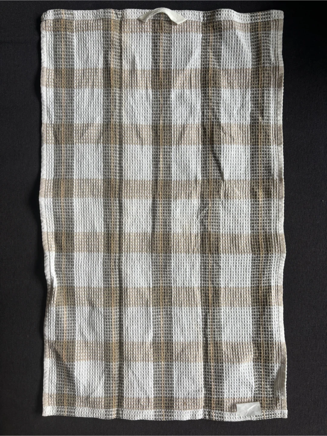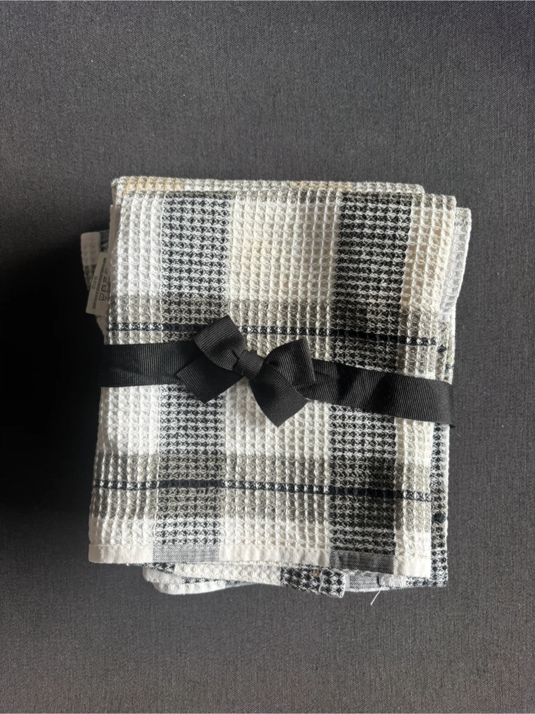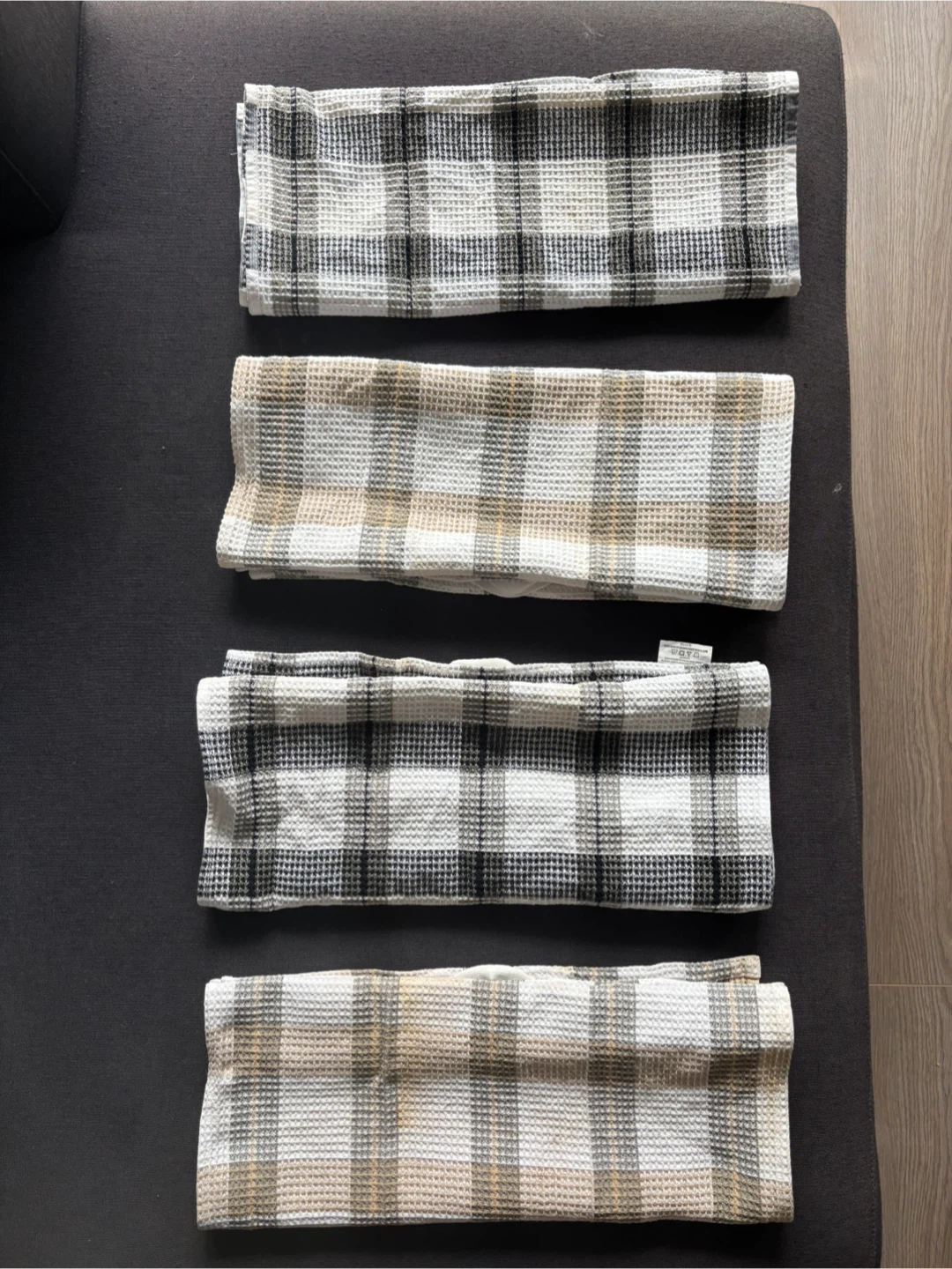 Selling a set of four 100% cotton kitchen towels with a charming plaid pattern and waffle weave texture.