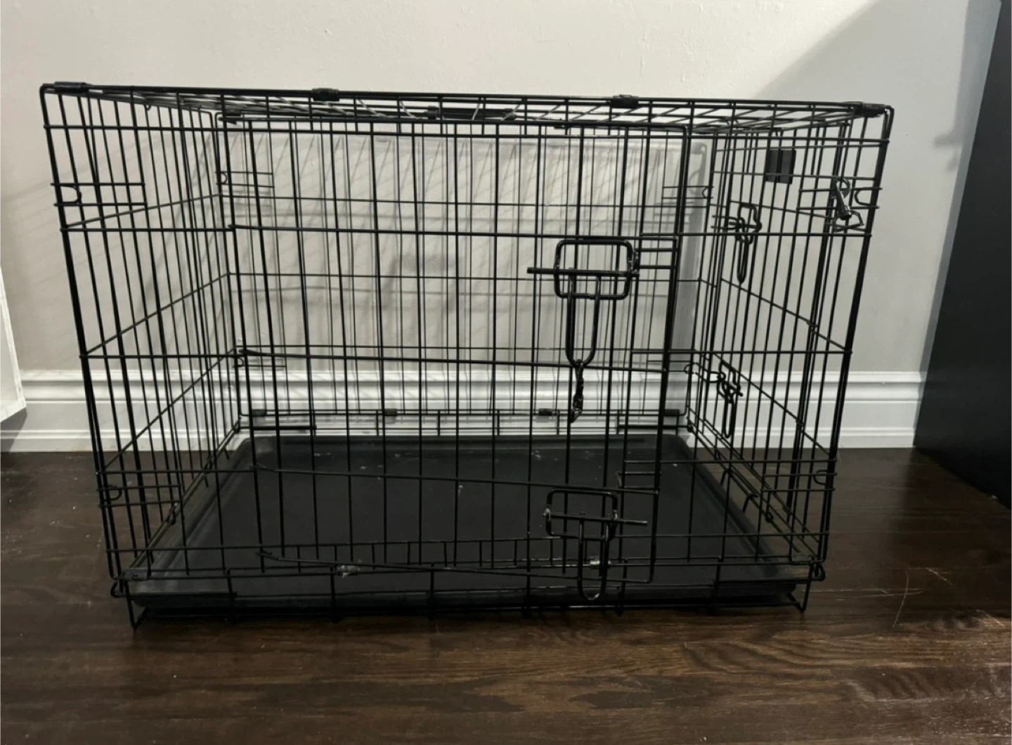 Selling a black dog crate in almost new condition! It's perfect for providing a safe and comfortable space for your furry friend. It includes a tray for easy cleaning. Medium size.