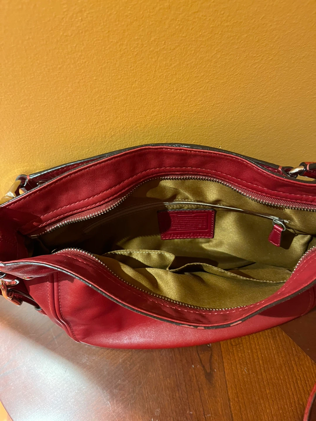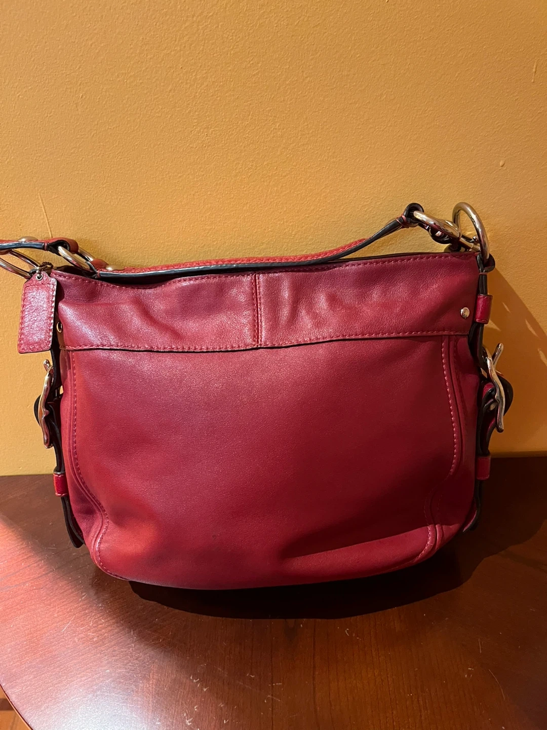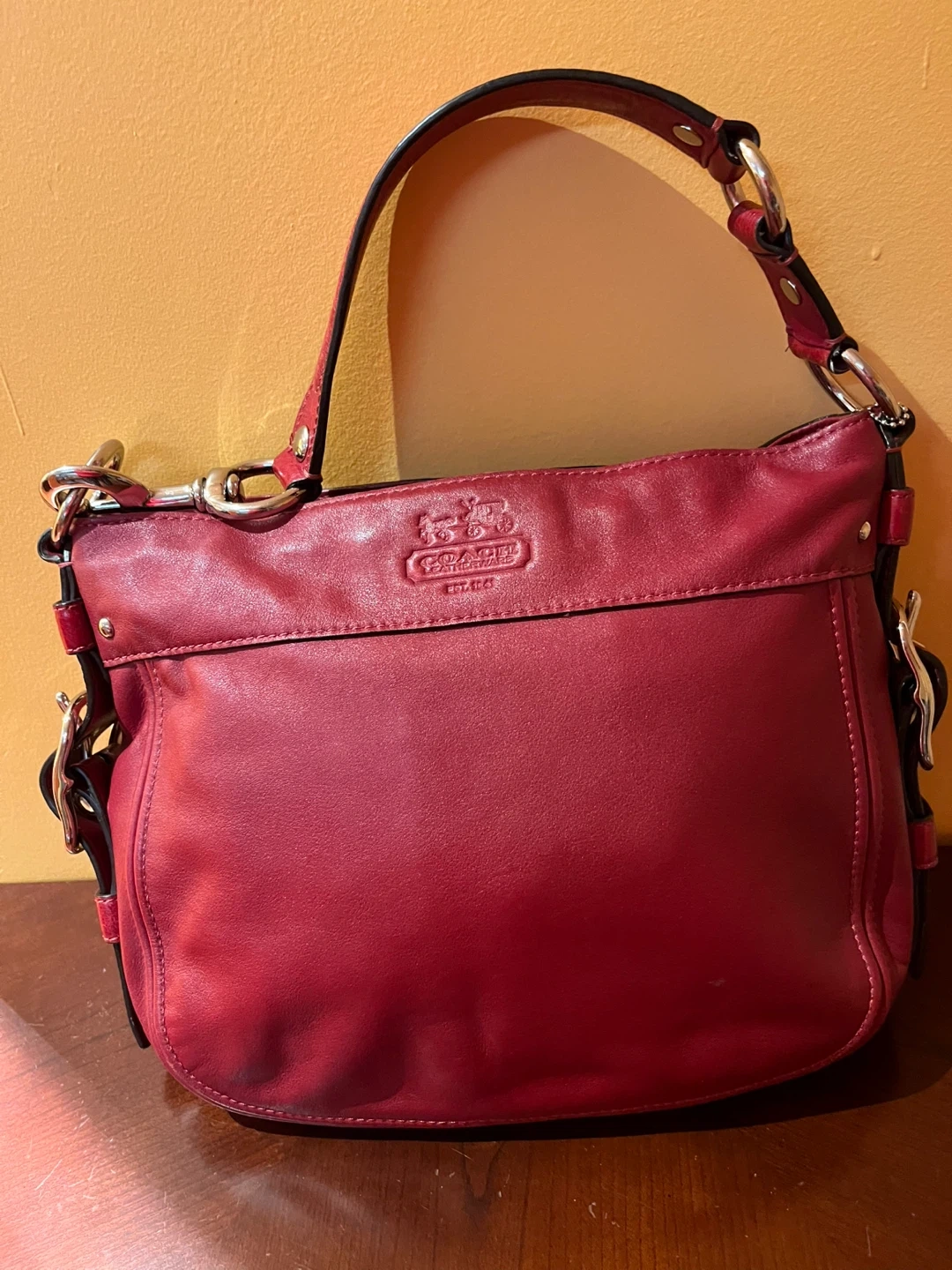 Lovely red leather handbag from Coach. Hardily used. Like New. It has a classic design and perfect for everyday use.