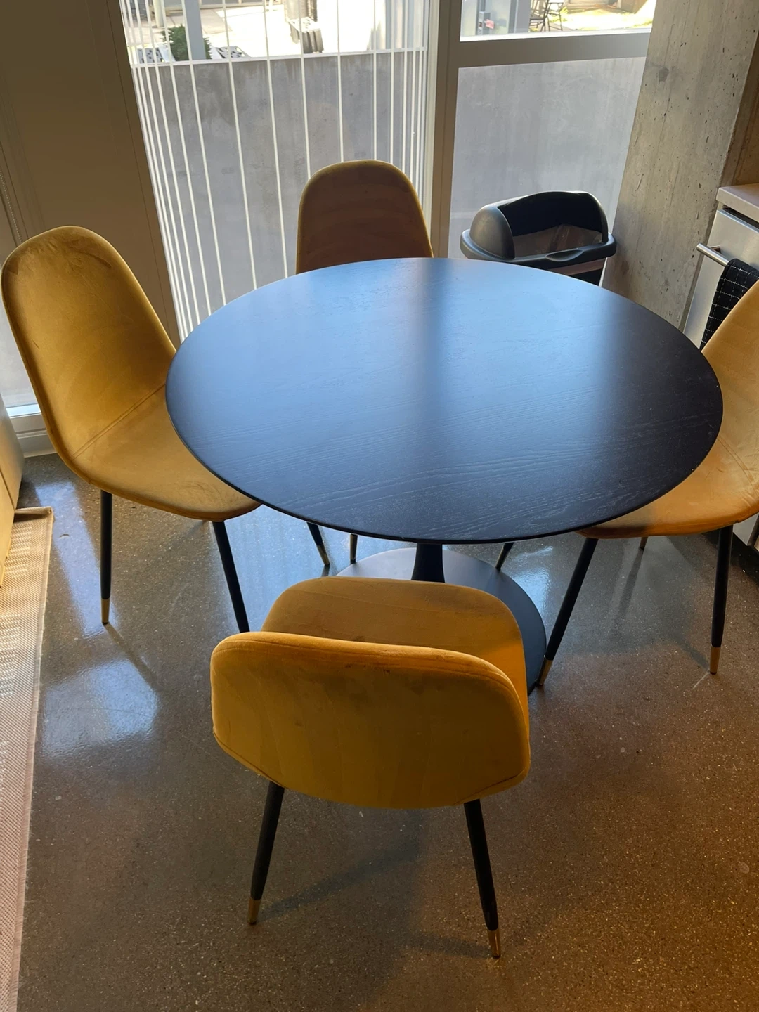 Selling a round dining table with four chairs. The table is black and the chairs are a vibrant yellow. Perfect for a small dining area or kitchen nook! The chairs feature a stylish design with black legs and gold accents.