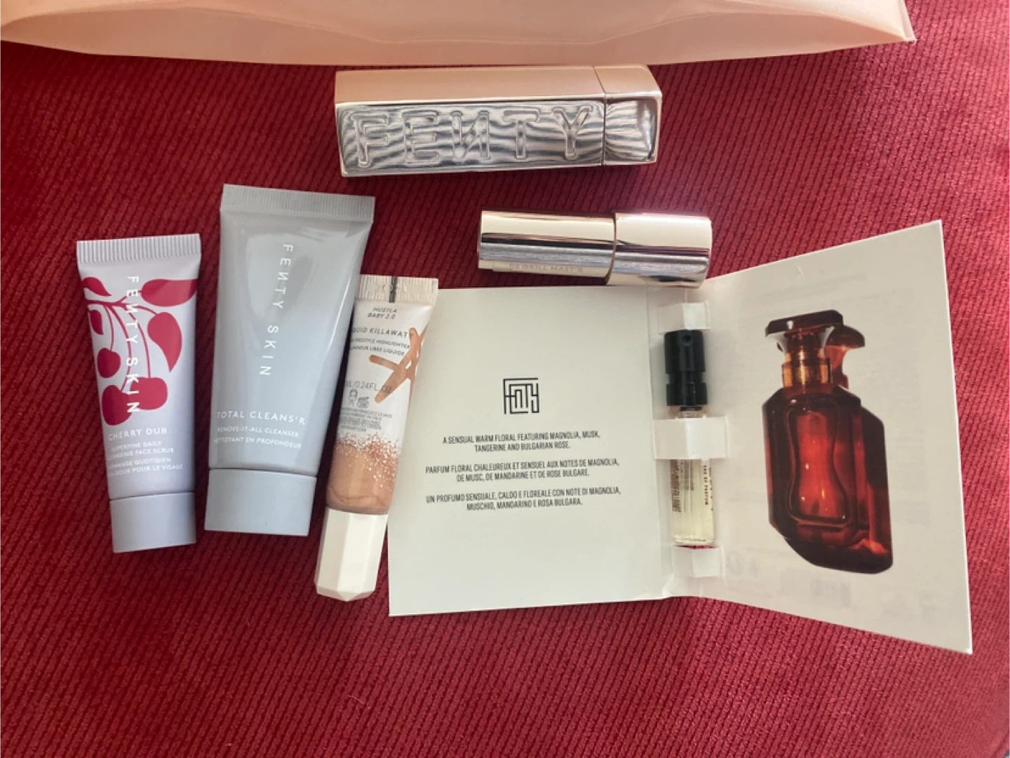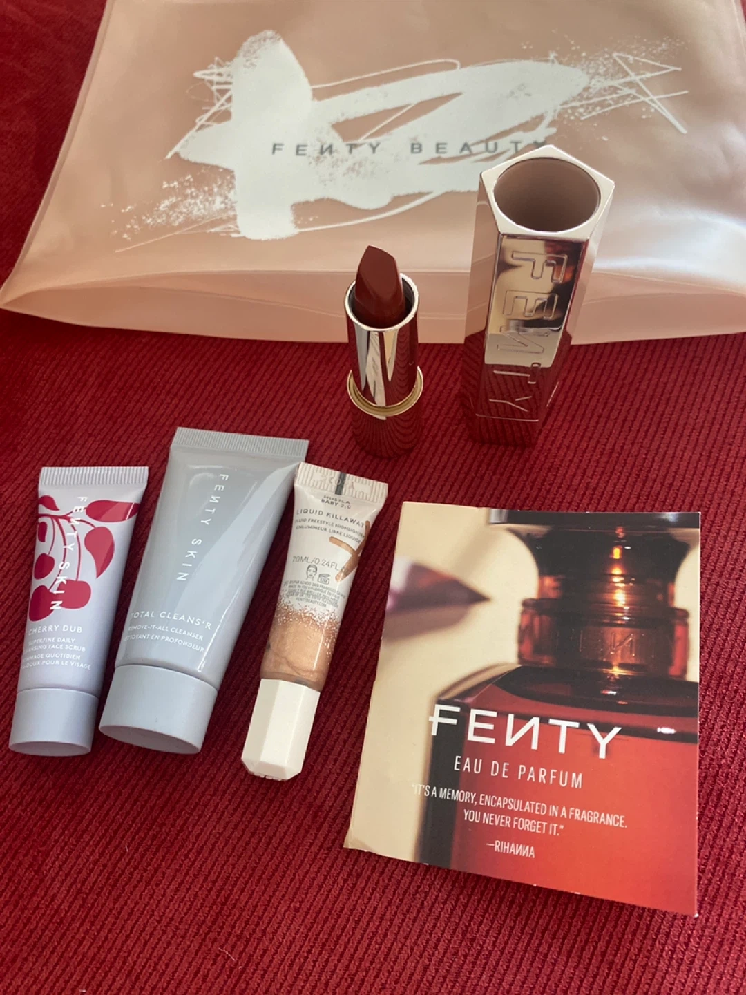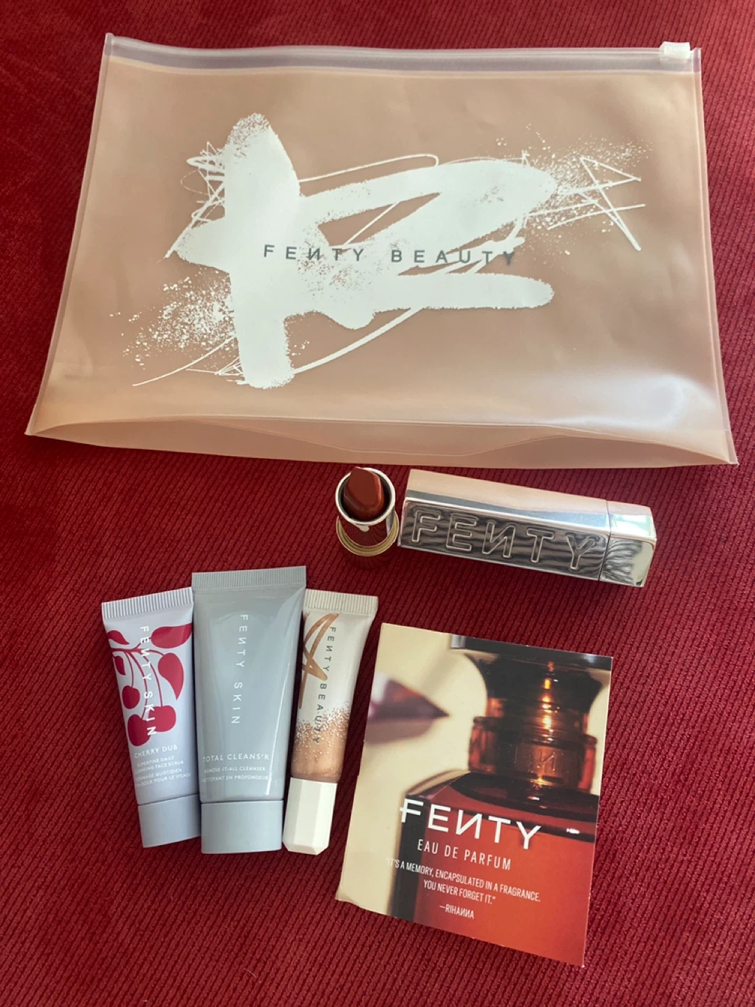 Selling a Fenty Beauty travel/sample size set that includes a variety of makeup and skincare items. The set features a lipstick, cleanser, and other beauty essentials, all from Fenty Beauty. Perfect for trying out different Fenty products!