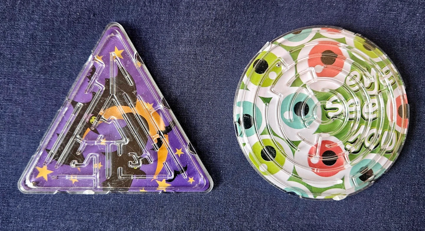 Giving away two fun puzzle games from Greenbrier! One is triangle-shaped with a witch design, and the other is round with an eyeball pattern. Perfect for some Halloween-themed entertainment.