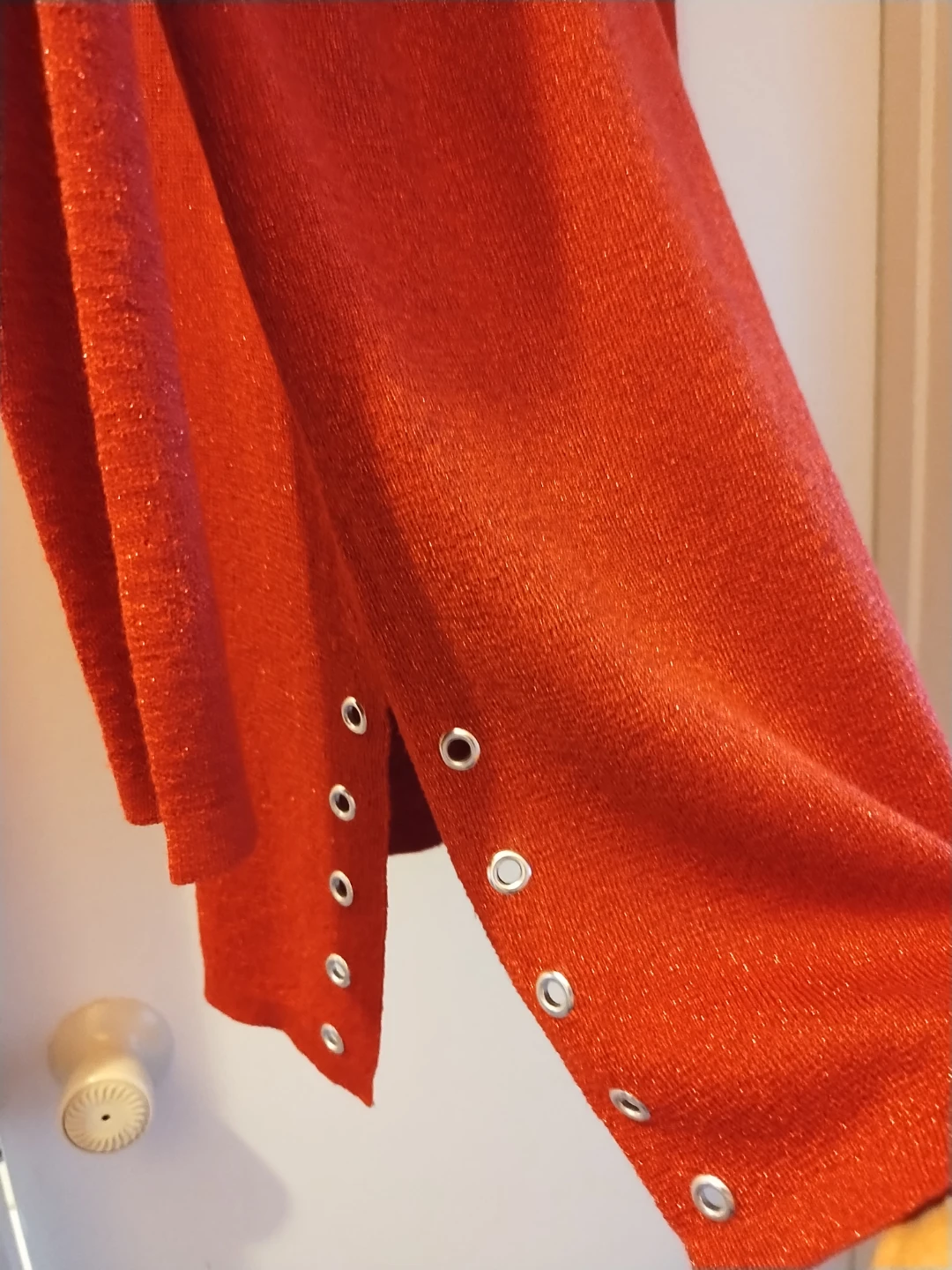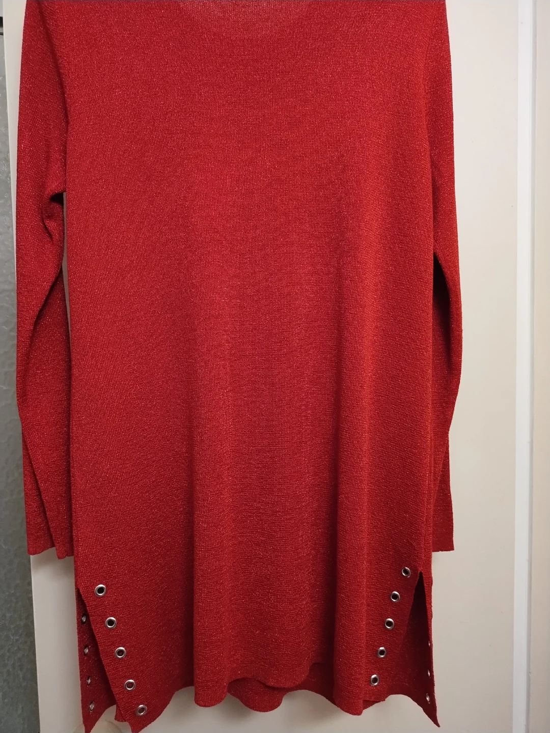 A very nice red top by Lily Morgan. It is a size M/M and made of 78% Viscose and 22% Metallic fibre. The top has a metallic shimmer and decorative eyelets on the shoulders and hem.