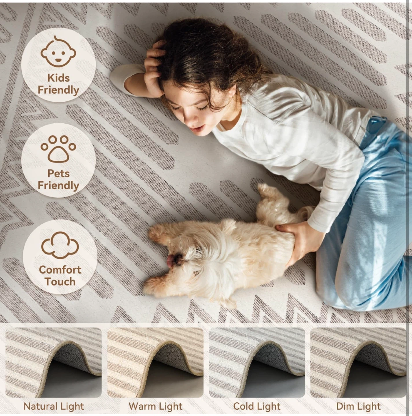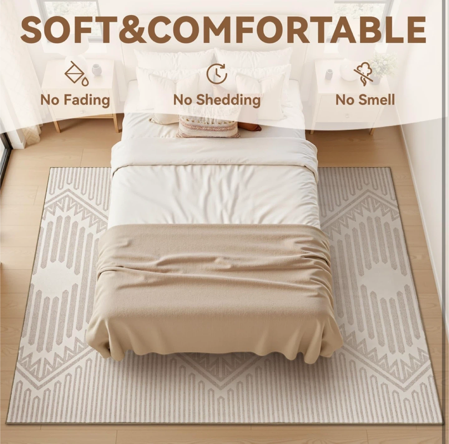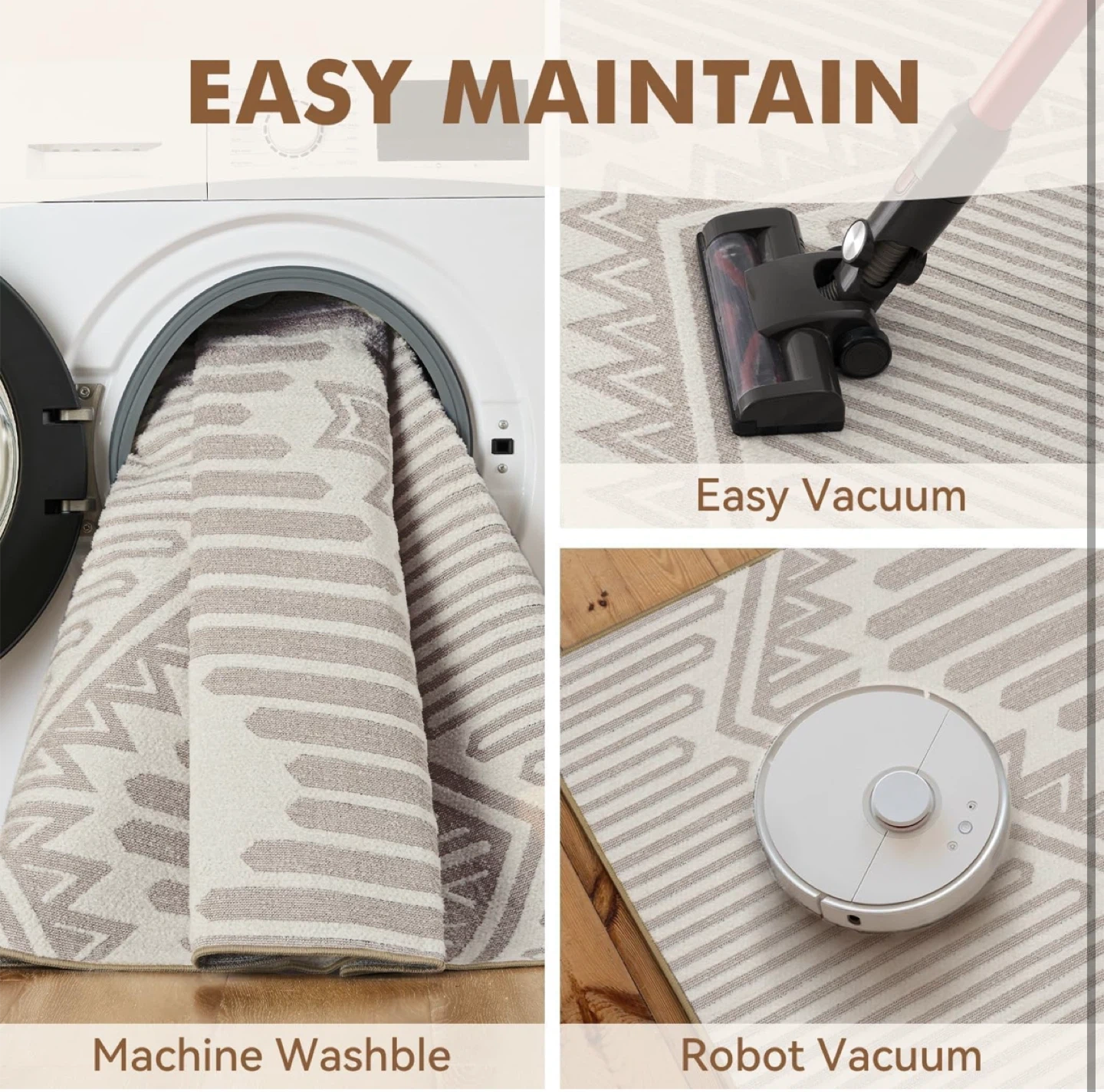 This area rug features a geometric pattern in neutral tones. It's designed to be soft and comfortable, with a high-low textured surface. The rug is easy to maintain, being machine washable and suitable for robot vacuums. It also has a TPR backing for non-slip and noise reduction benefits