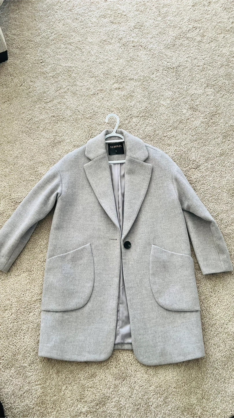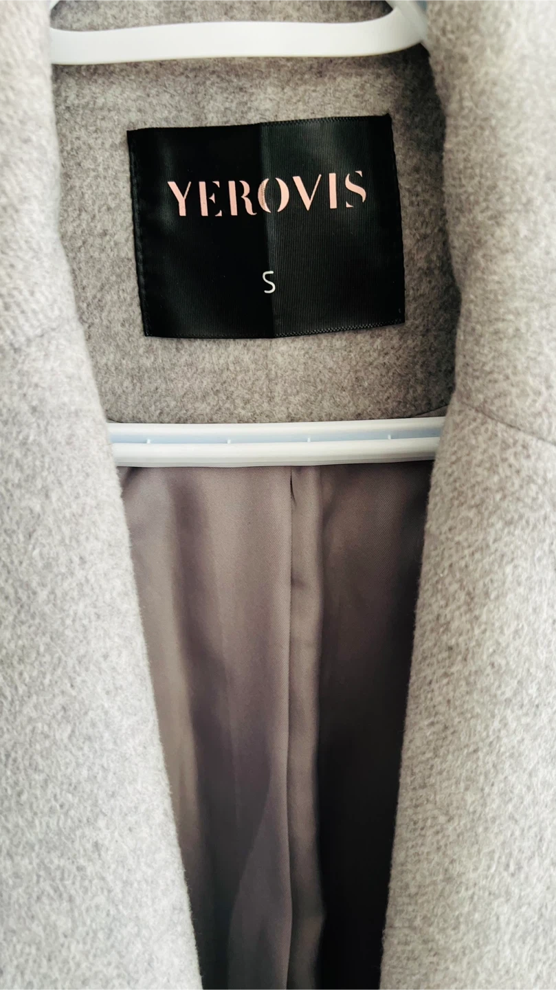 A lovely grey women’s coat from YEROVIS, perfect for layering! It's a size small and made from a wool blend. It features a single button closure and stylish pocket detailing.