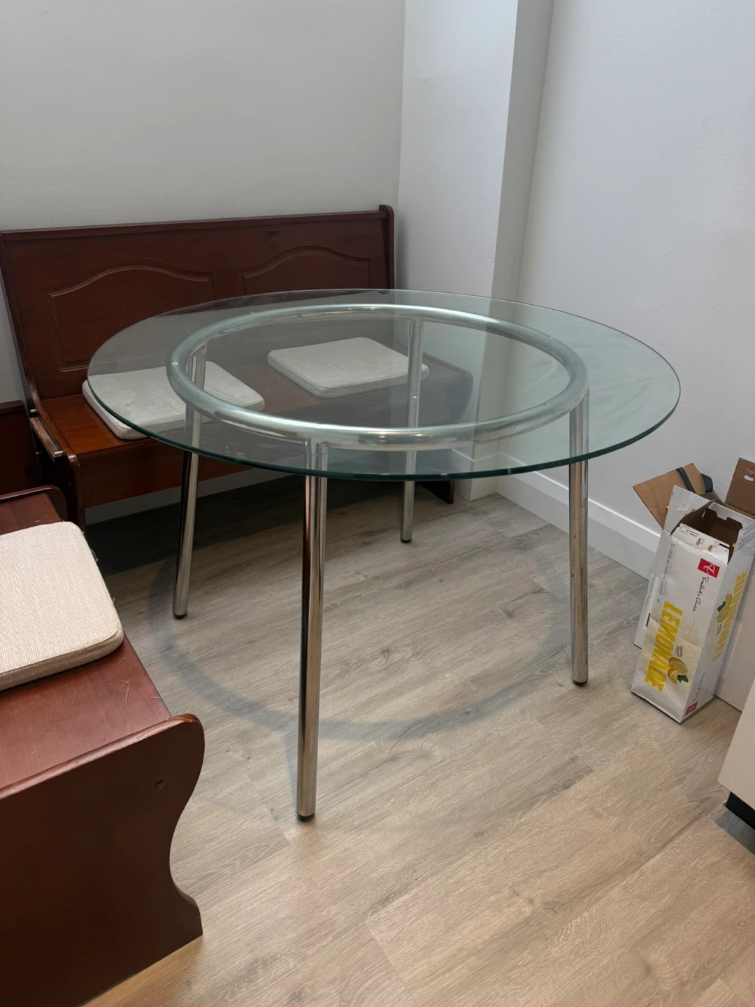 Selling a round glass dining table with a metal frame. It's in good condition and would be a great addition to any dining space