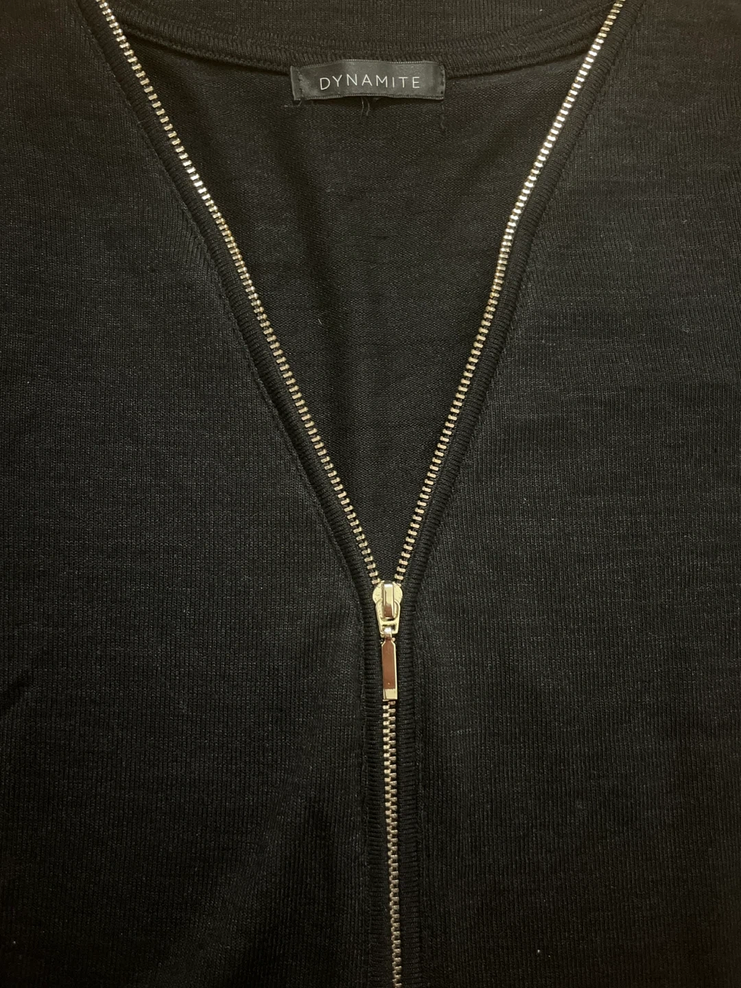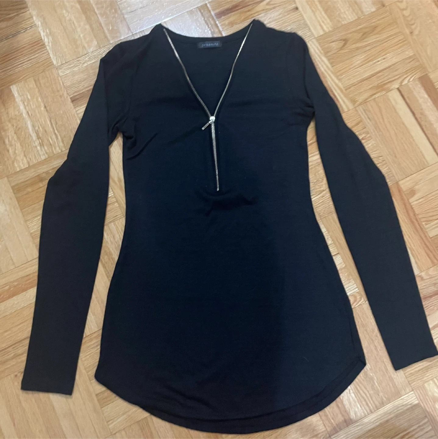60Selling a black long-sleeve top from Dynamite! It's a size XS and features a stylish zipper detail. The material is a comfy blend of 51% polyester, 46% rayon, and 5% spandex. Very soft and comfortable material. New shirt-too small for me.