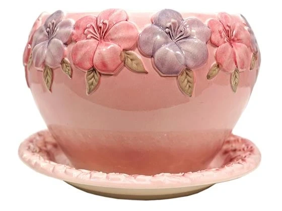 45Add a touch of charm to your plants with this lovely pink ceramic planter. It features a beautiful floral embossed design and comes with a matching saucer. Perfect for adding a pop of colour to your indoor or outdoor space