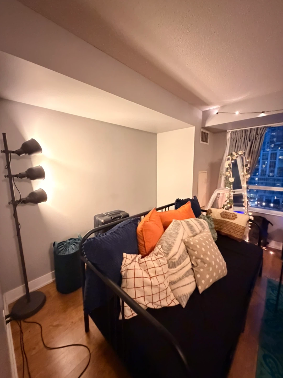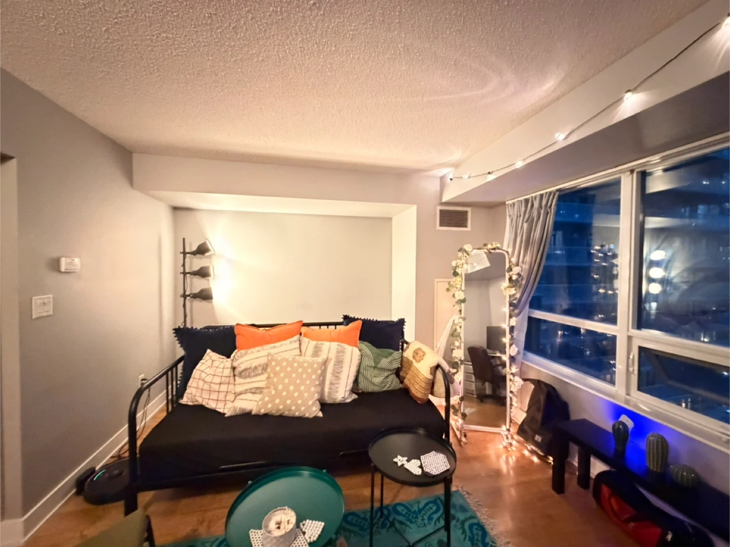 Comfy sofa that pulls out into an almost-queen sized bed - easily fits two adults. Comes with two firm foam mattresses (stack them for a cozy single, lay them side-by-side when you pull it out for sleep).