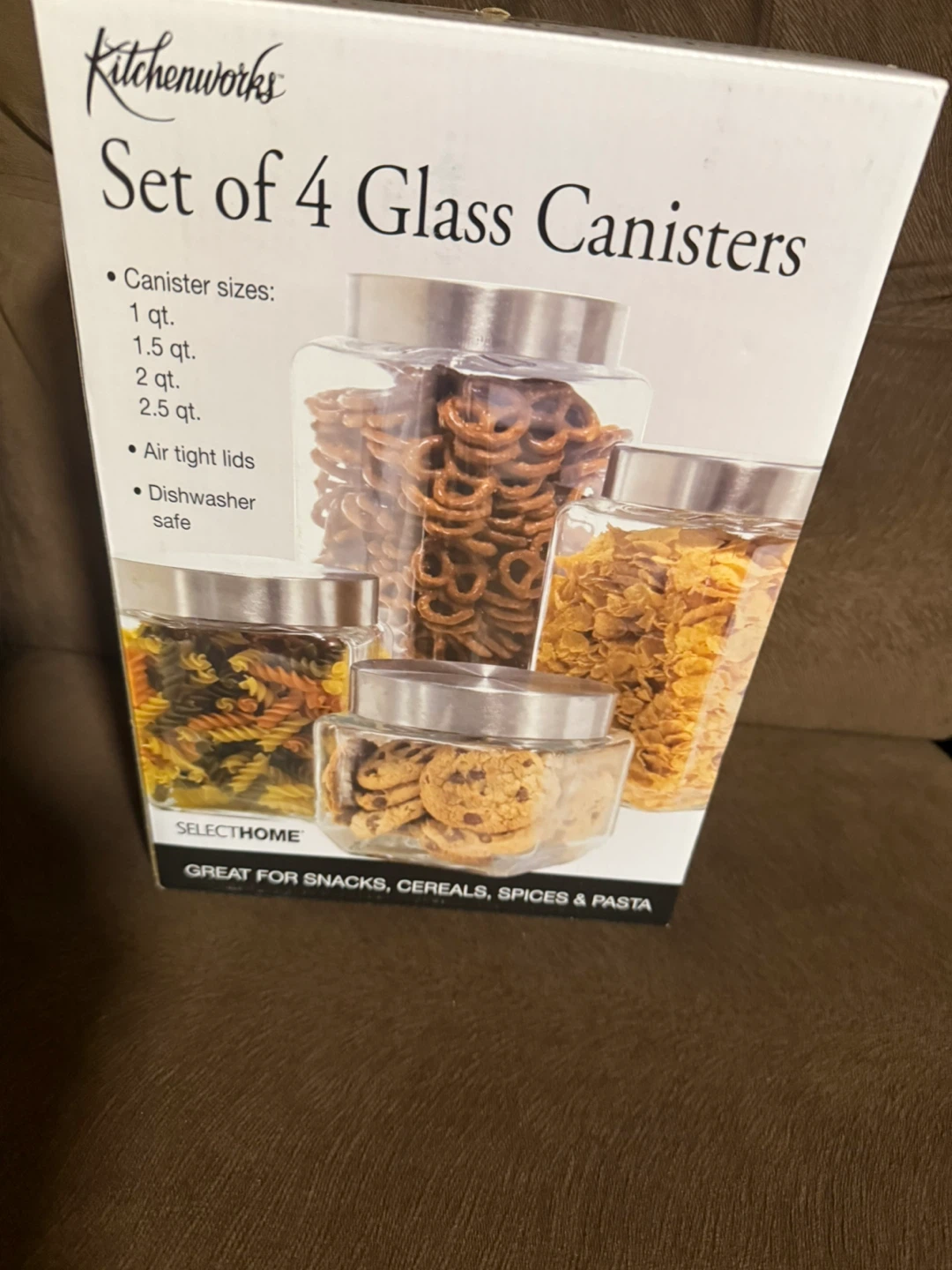 Selling a Kitchenworks set of 4 glass canisters. These are great for storing snacks, cereals, spices, and pasta. The canister sizes are 1 qt, 1.5 qt, 2 qt, and 2.5 qt. They feature air-tight lids and are dishwasher safe