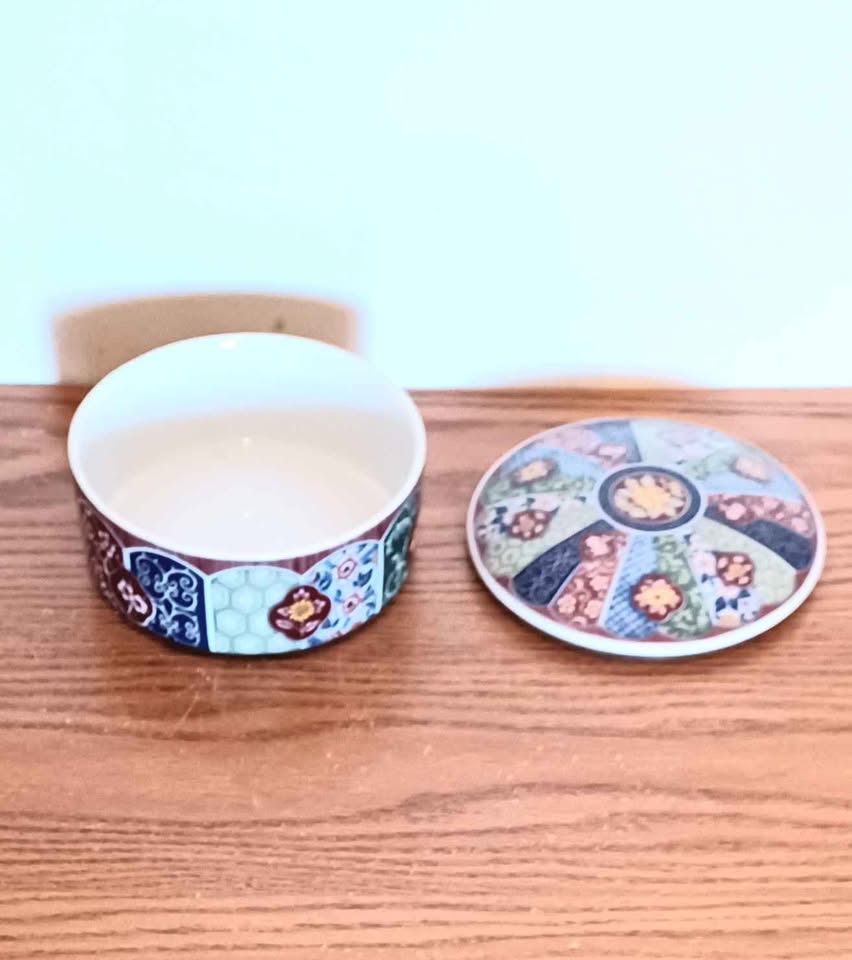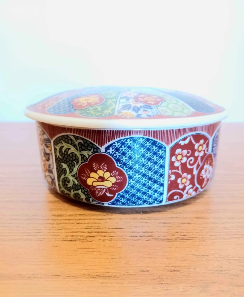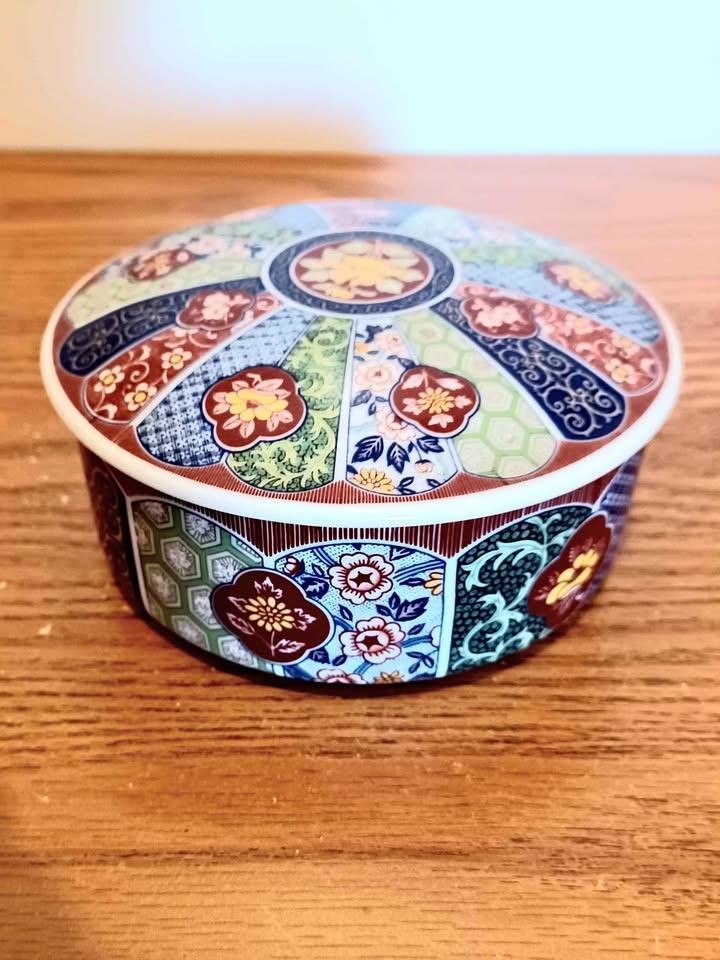 Vintage, Collectible, Hand Painted, Japanese, Imari lmperial Porcelain, Round, Stamped Floral Storage/Trinket Box with Lid. Hand Decorated Porcelain, Household. Diameter : 12 cm. Mint Condition, no chips or cracks.