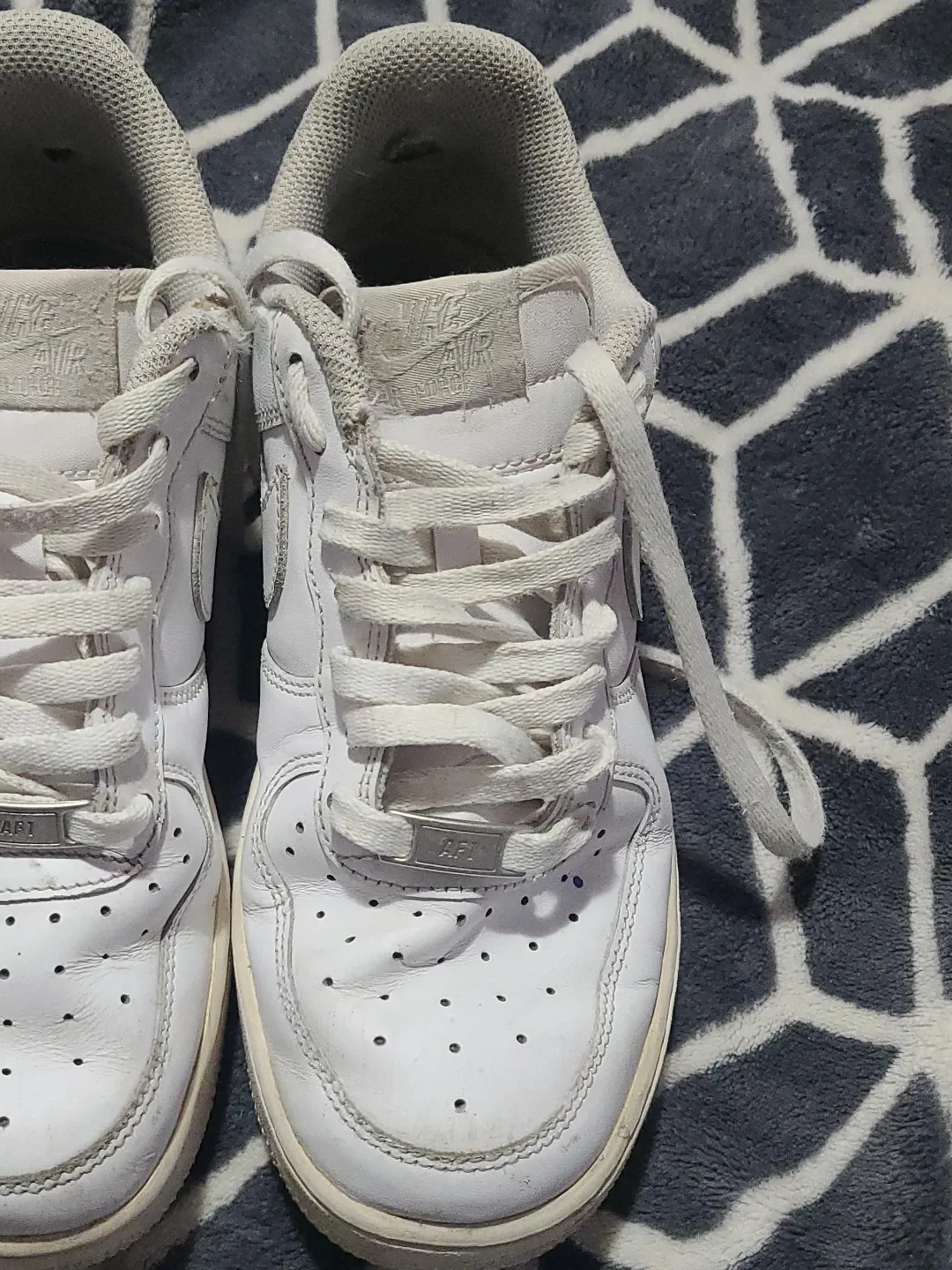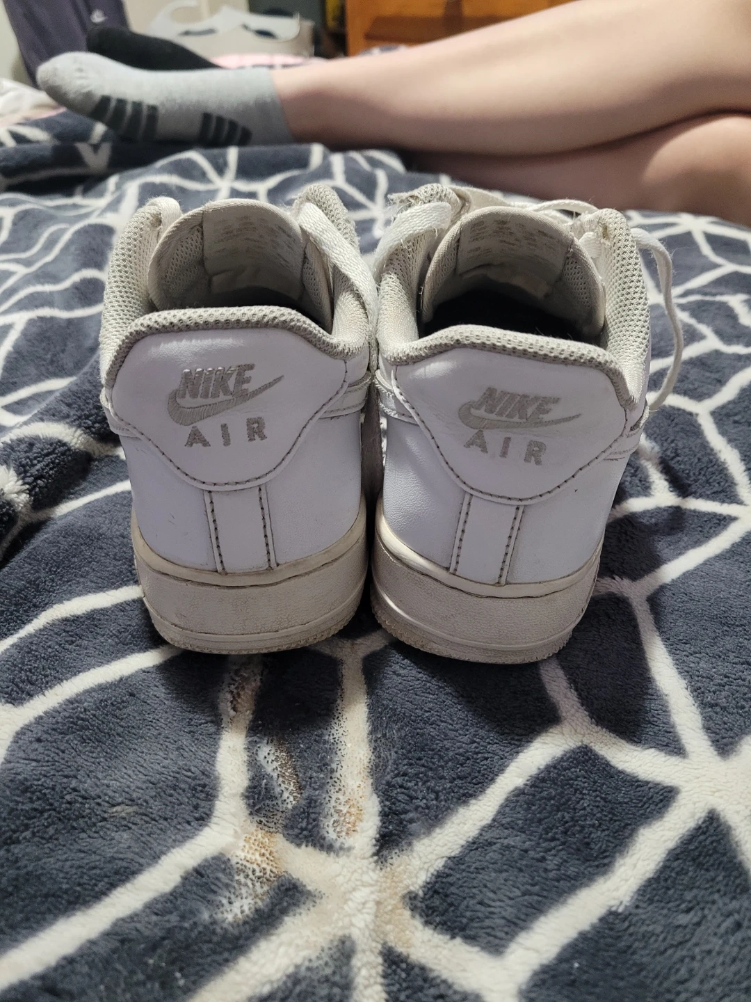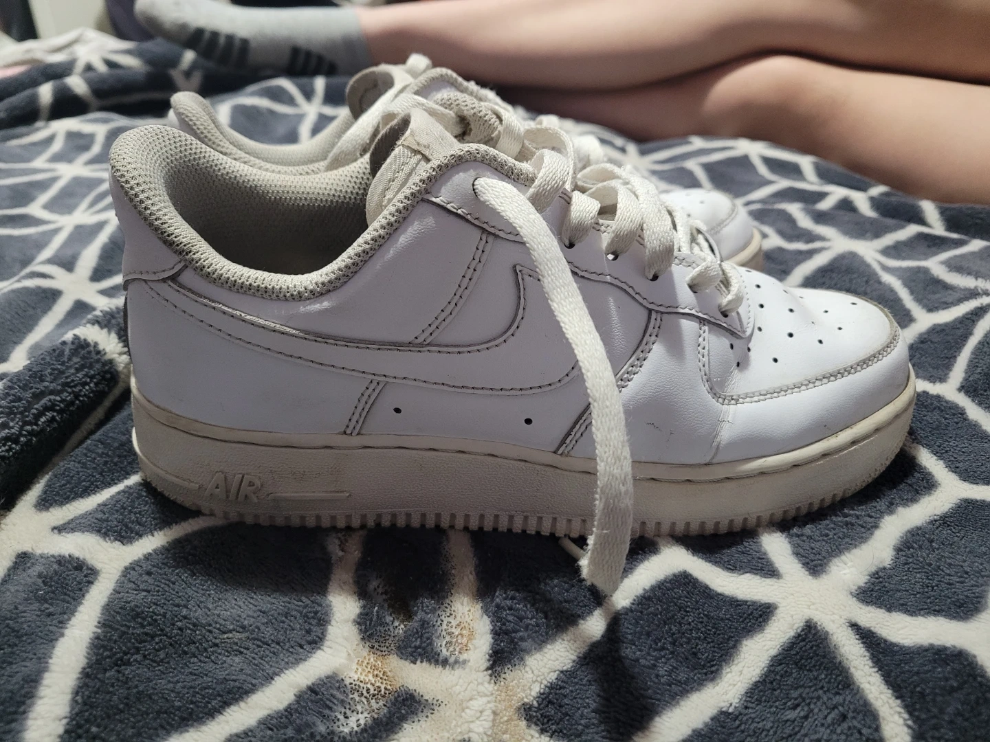 Selling a pair of Nike Air Force 1 sneakers in white. They show some signs of wear, but still have plenty of life left in them! Classic style and comfortable fit. Size 8.