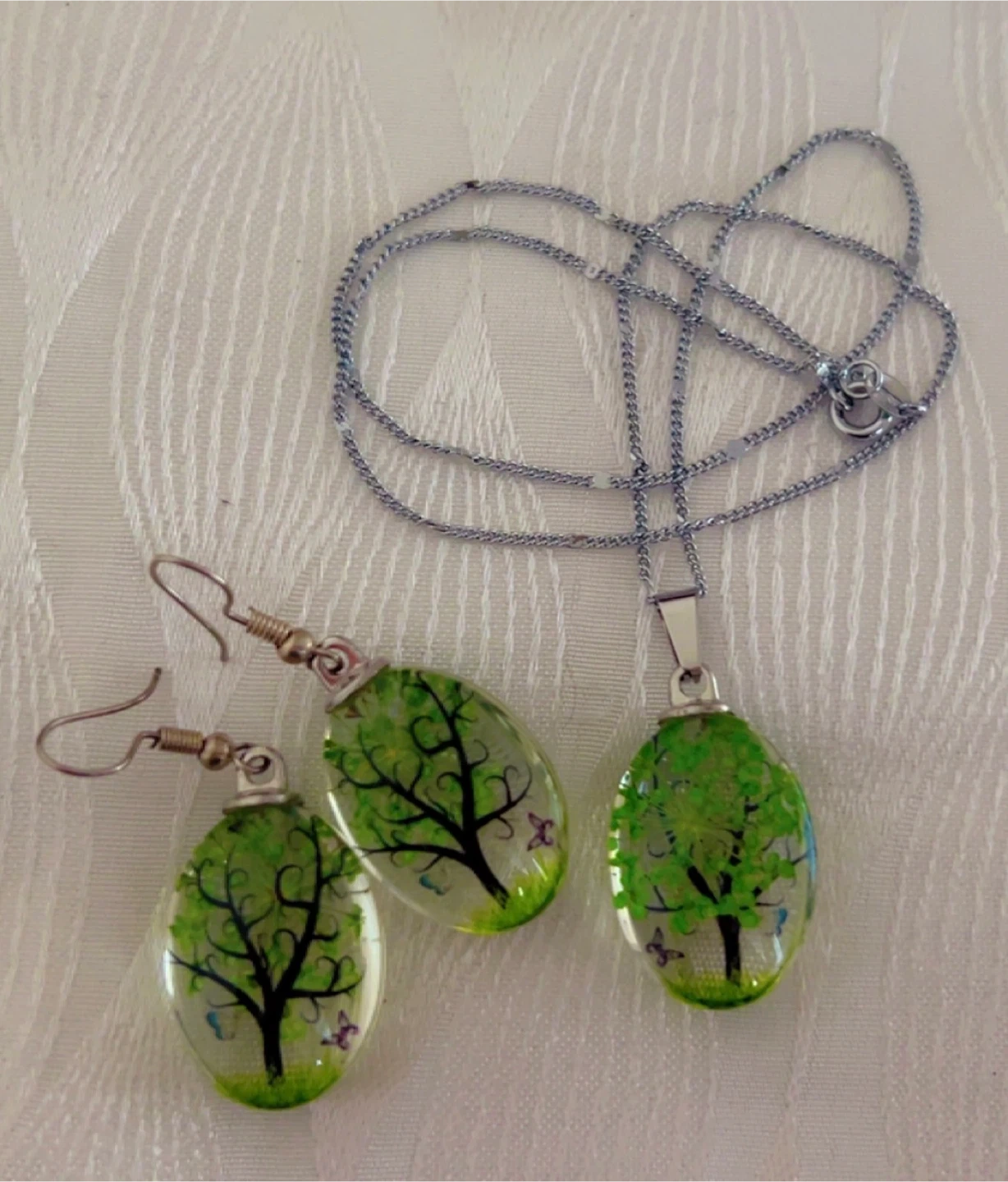 Beautiful handmade necklace and earrings set featuring a tree of life design! The set includes a necklace with a silver chain and matching earrings. Perfect for adding a touch of nature-inspired charm to any outfit