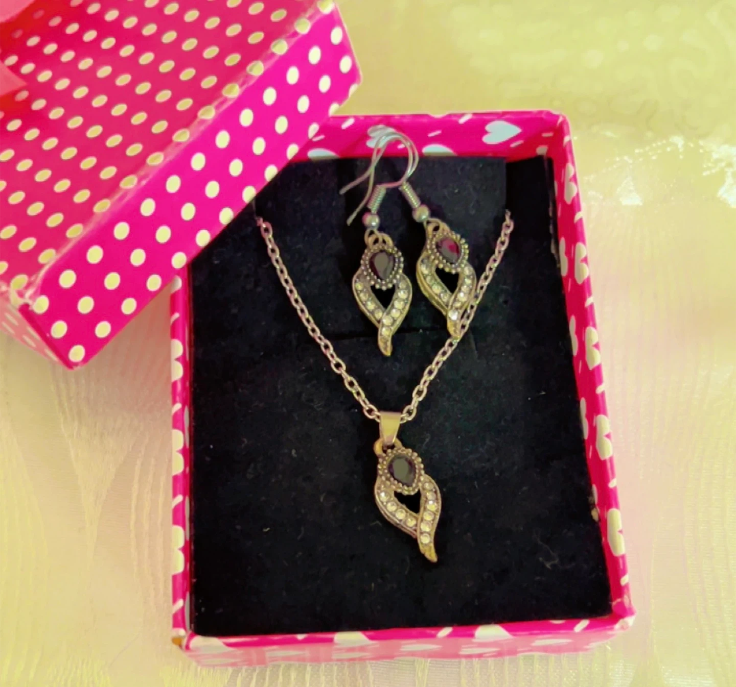 A lovely jewellery set featuring a necklace and matching earrings. It comes in a cute pink polka dot box, perfect for gifting or keeping it safe. The set has a vintage-inspired design with a dark stone accent.