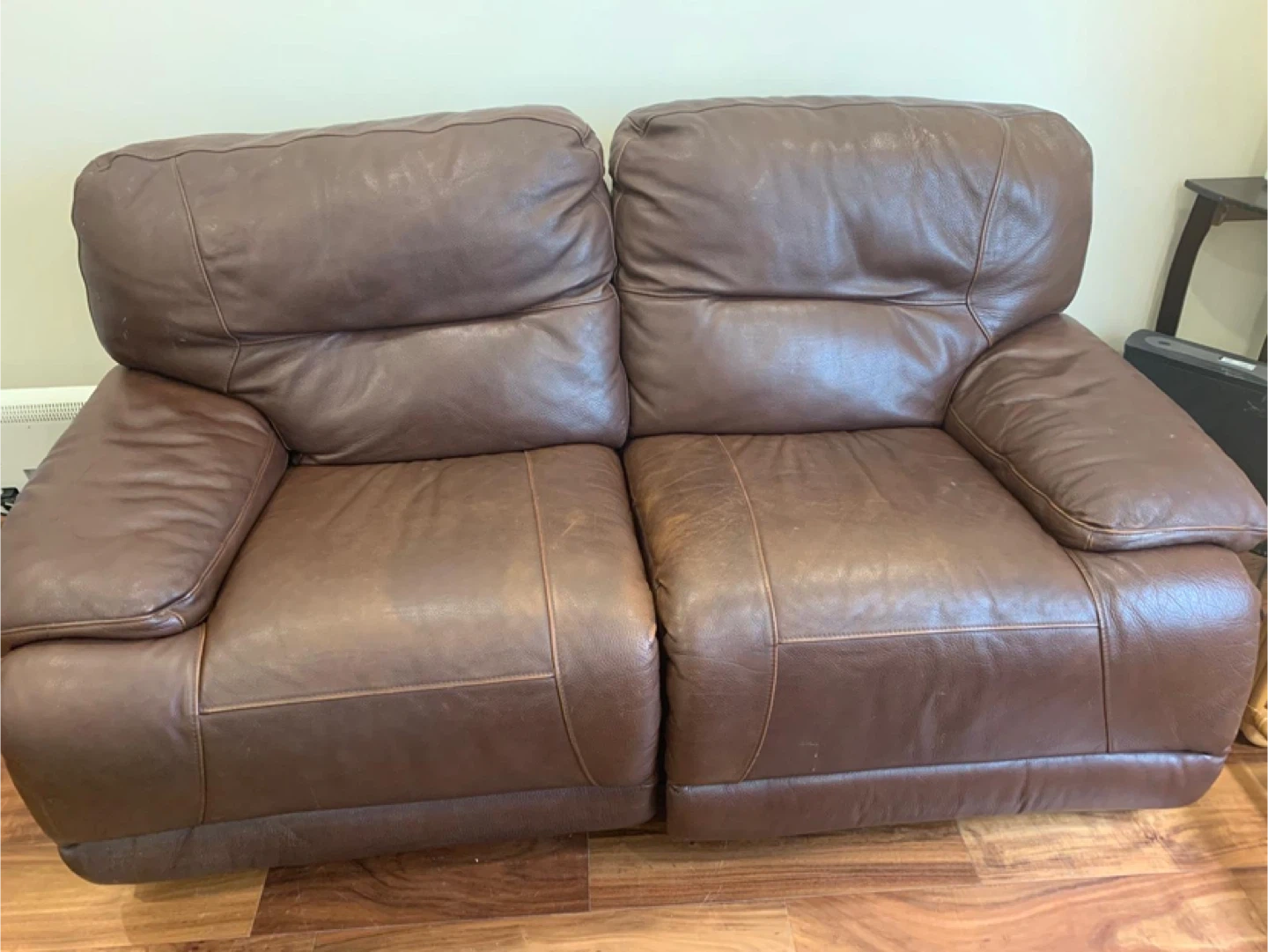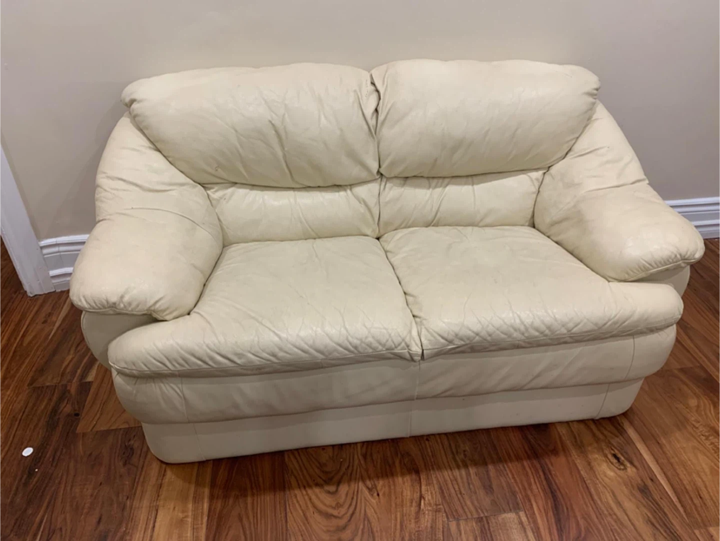 Selling a comfy leather loveseat and recliner set! Both pieces show some signs of wear, but are still in good condition and very functional. The loveseat is a creamy off-white colour, while the recliner is a rich brown. Perfect for a living room or den! Pick up from Queen street and woodbine. Everything is free and available for quick pick up - placed on front yard.