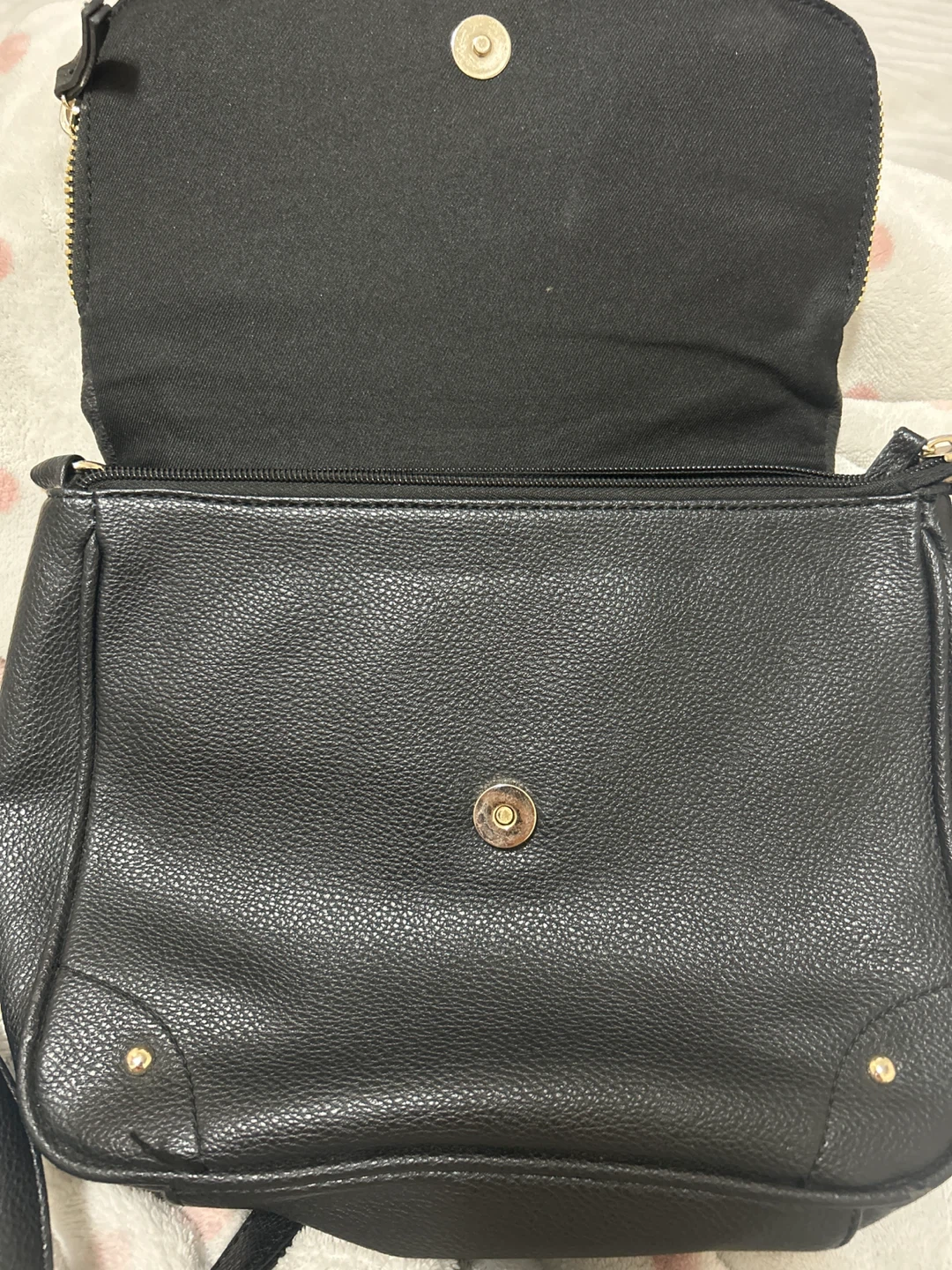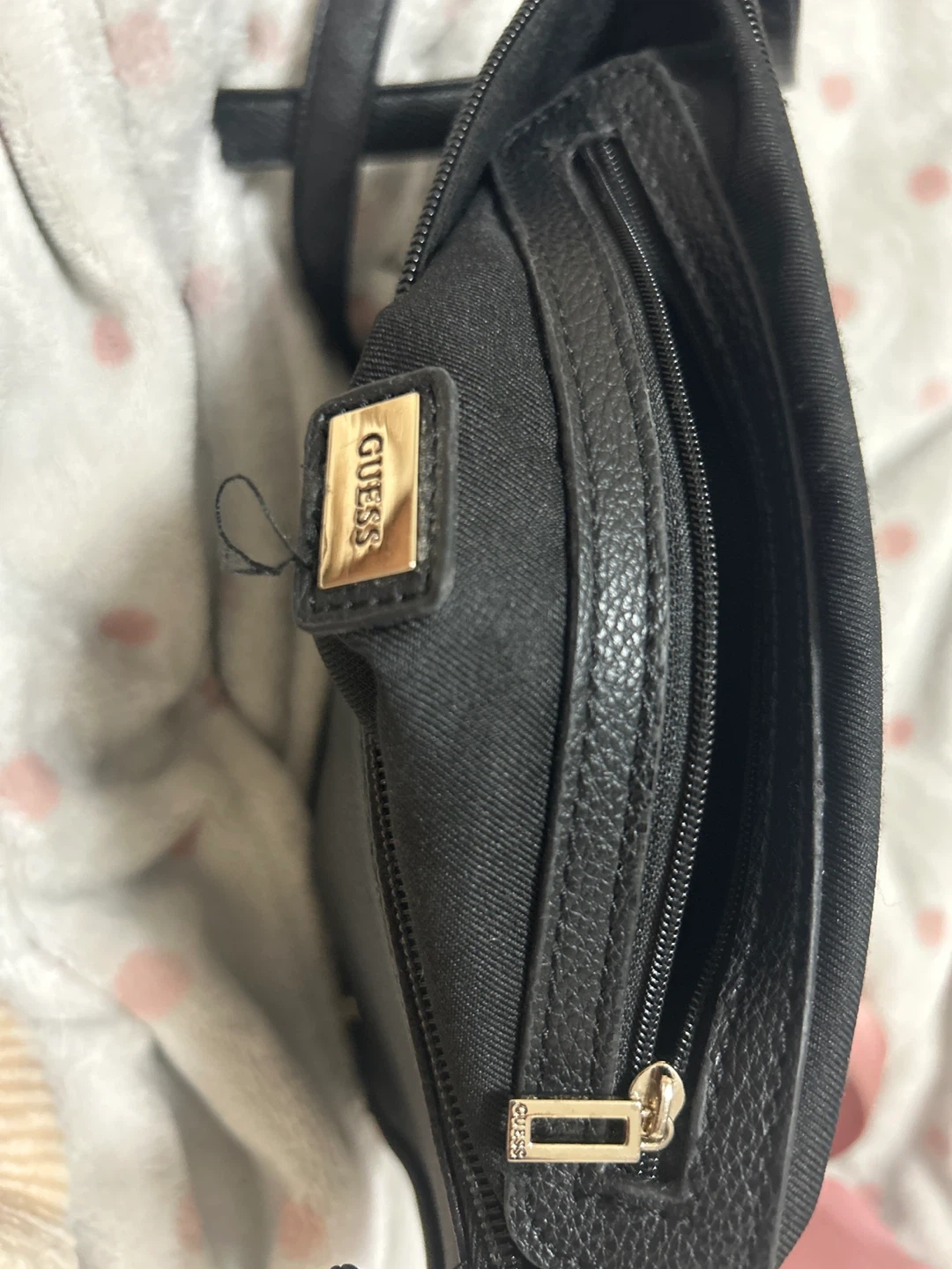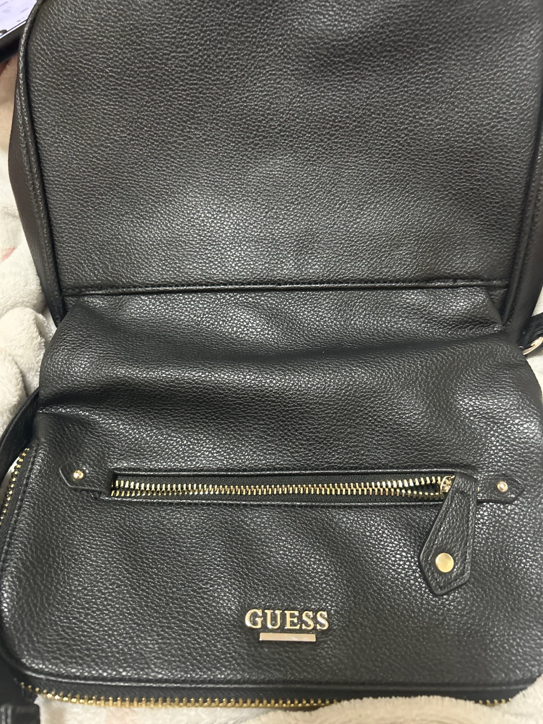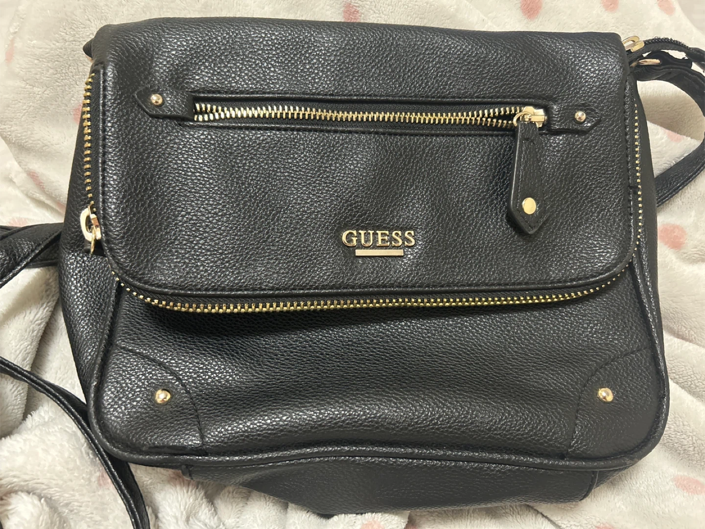 Selling a gently used Guess crossbody bag in black. It's in great condition and perfect for everyday use. Features gold-tone hardware and multiple compartments inside.