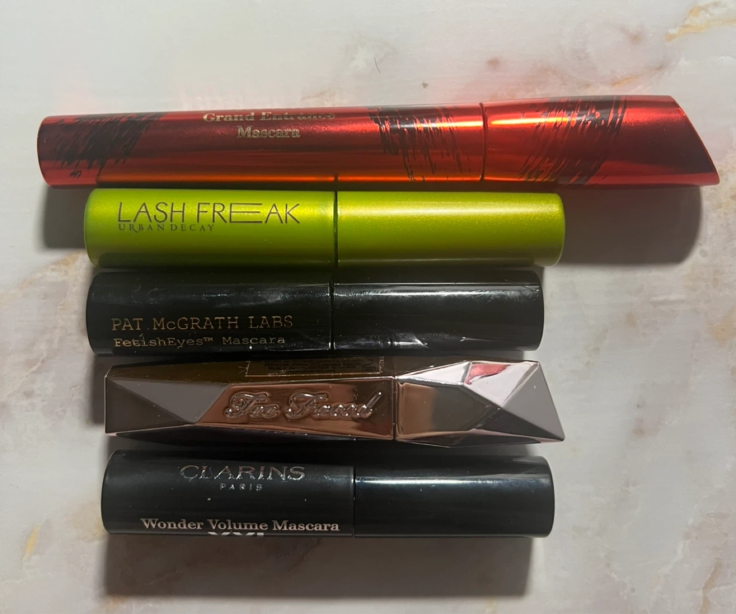 Selling a collection of mascaras including Elizabeth Arden, Urban Decay Lash Freak, Clarins Wonder Volume Mascara, and Too Faced mascara