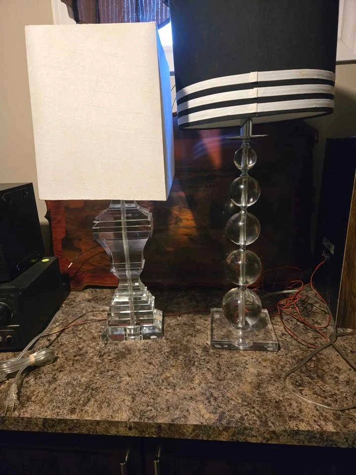 21Neat and heavy glass lamps. Both work fine. Some very small yellow marks on shades that should come out no problem. Please see video and pictures for condition. Asking $60 each or $100 for the two of them. Pick up Welland. Feel free to message if interested or any questions.