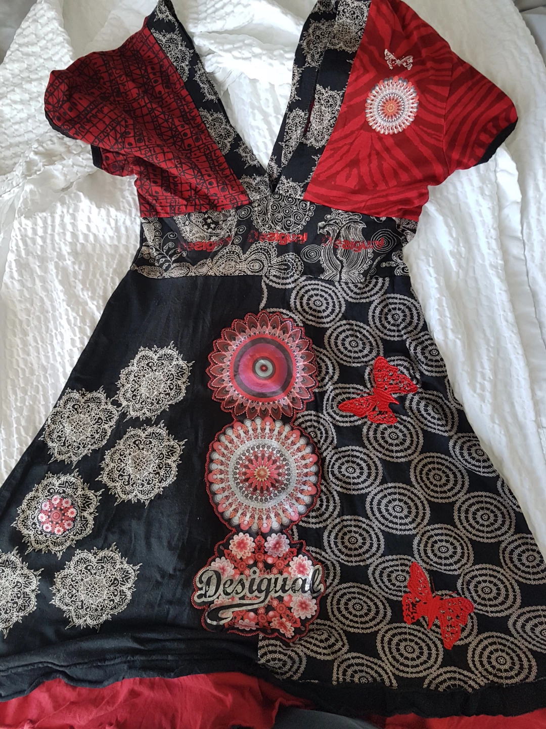 Selling a Desigual dress in size L. The dress is made of 55% cotton and 45% viscose. It features a unique design with a red butterfly and other colourful patterns. Please also check out my other listings on this account. This is a no pet/ smoke home. Pick Up Cochrane, Alberta