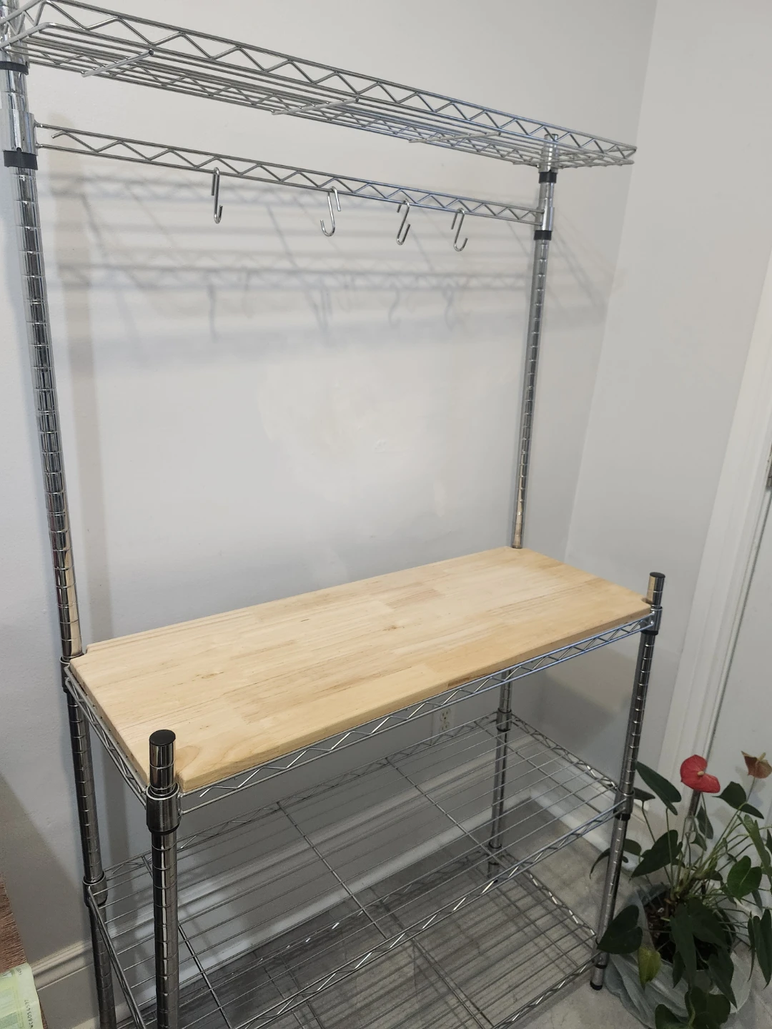 This chrome baker's rack is perfect for adding extra storage and workspace to your kitchen! It features a sturdy chrome frame with a wooden top, providing a durable and stylish surface for food preparation or displaying your favourite kitchen items. The rack also includes hooks for hanging utensils and additional shelving for storing pots, pans, or other essentials