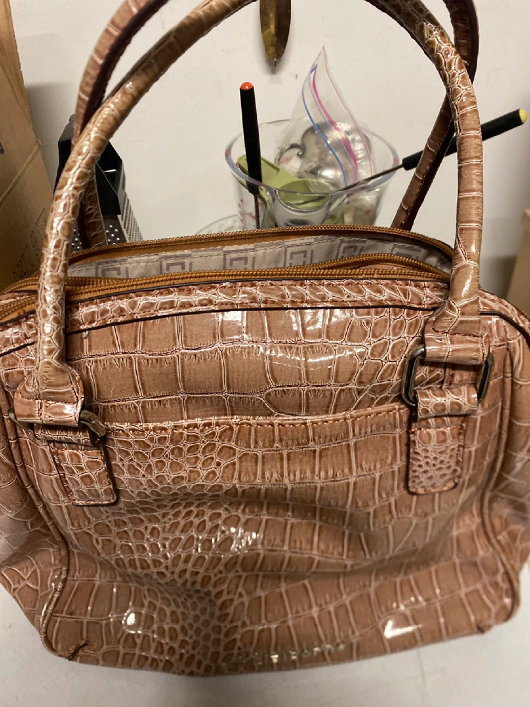 Selling a Liz Claiborne handbag with a beige croc-embossed design! It's in great condition and perfect for everyday use. The material gives it a stylish and unique look