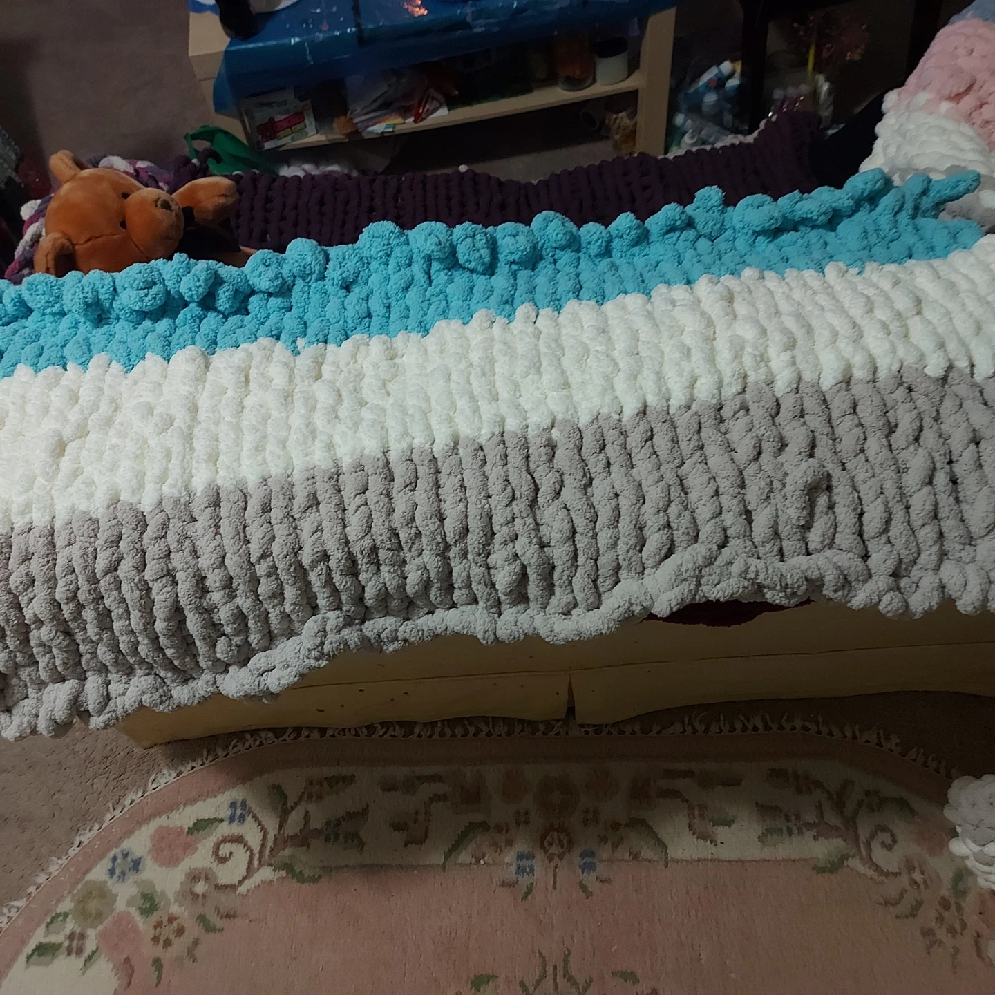 Selling a soft and cozy chunky knit blanket! It features a lovely striped pattern with colours including grey, white, teal and purple. Perfect for adding a warm touch to your home. I did add another layer of white wool to this blanket, it's very light.