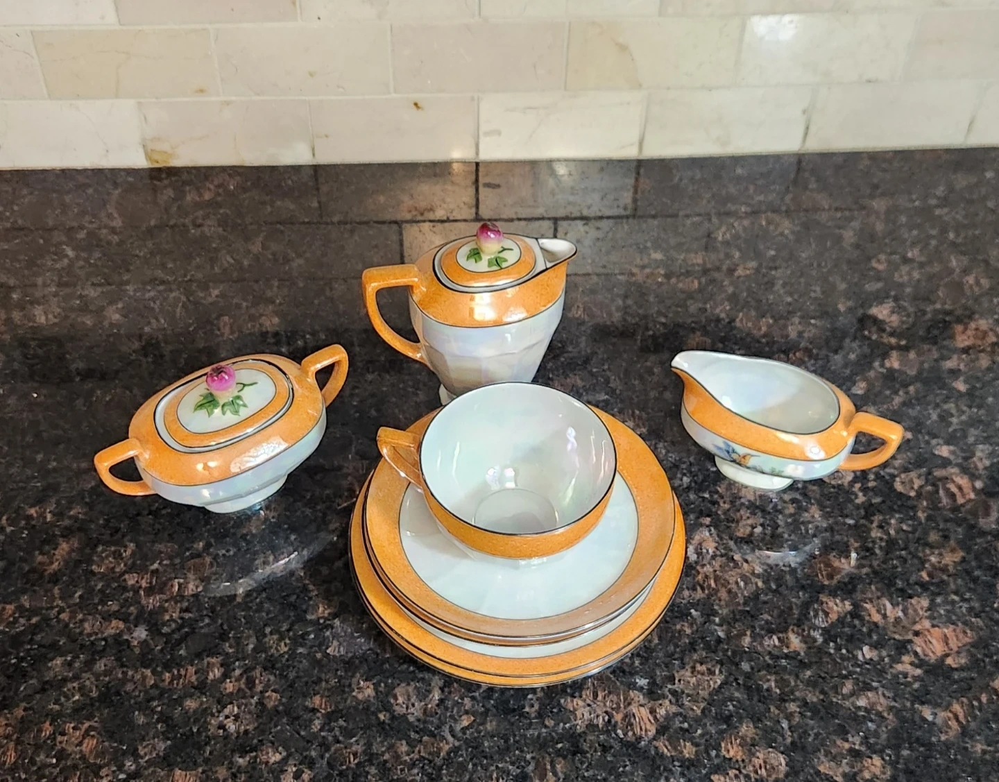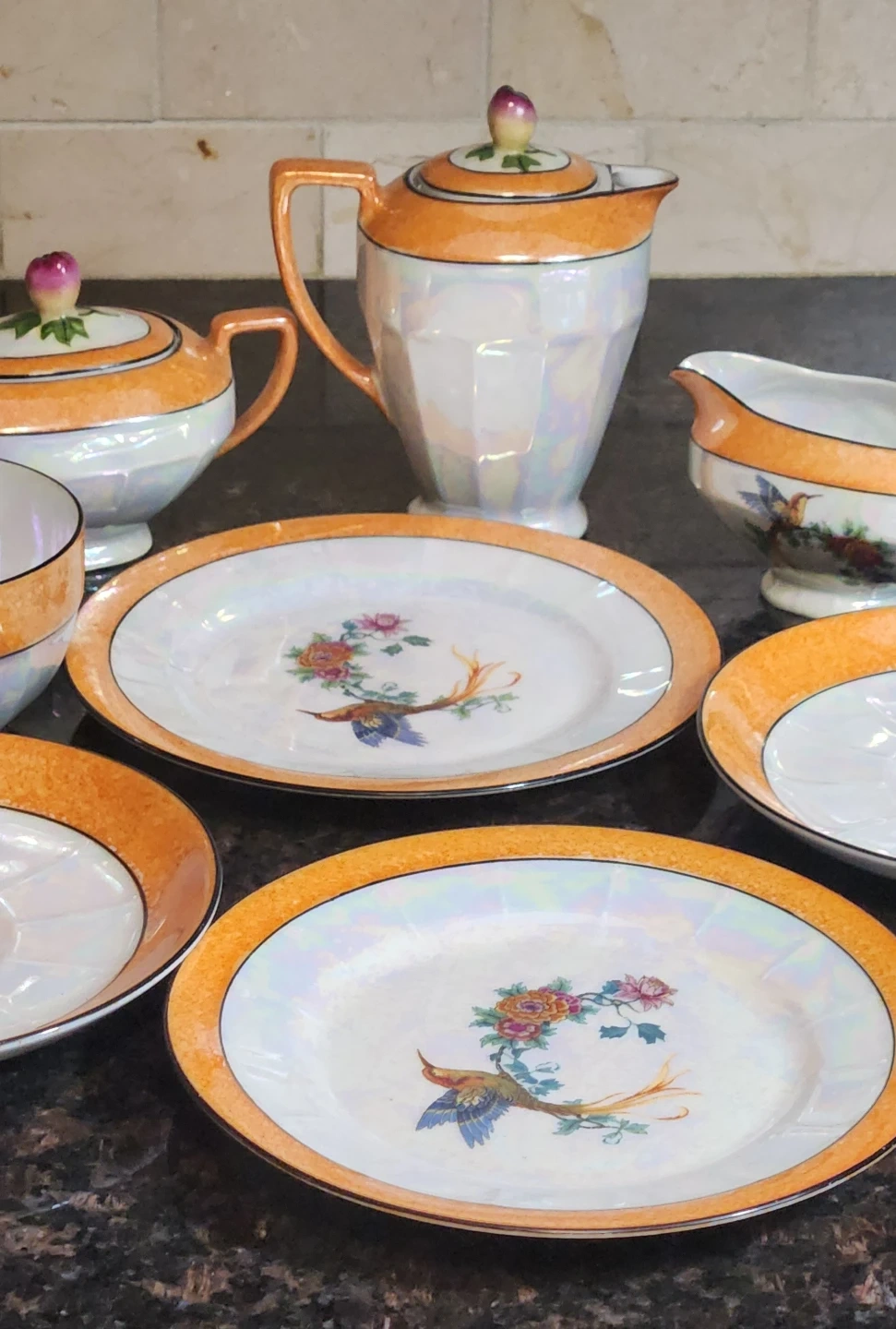 This is a lovely vintage Japanese tea set, featuring a delicate bird and floral design. The set includes a teapot, sugar bowl, creamer, cups, and saucers, all with a beautiful iridescent finish and orange trim. Perfect for adding a touch of elegance to your tea time!
