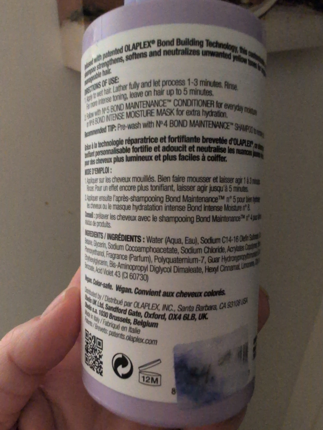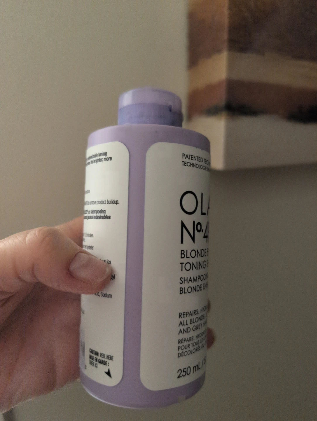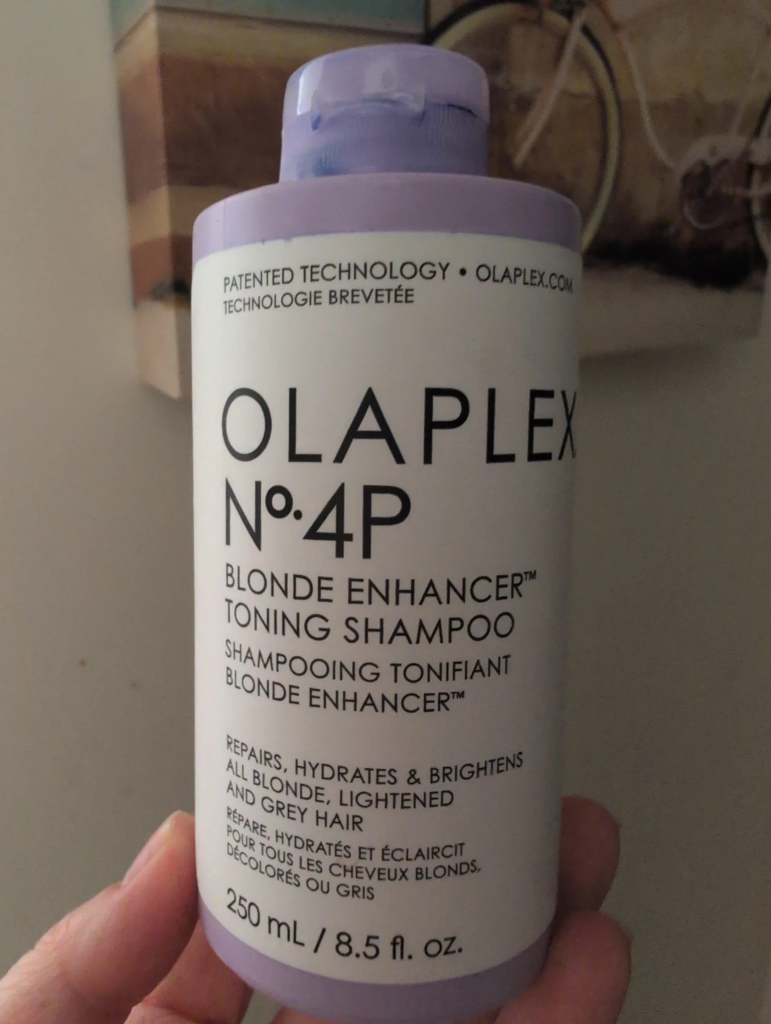 Selling a bottle of Olaplex No. 4P Blonde Enhancer Toning Shampoo. This shampoo repairs, hydrates, and brightens all blonde, lightened, and grey hair. It comes in a 250 mL / 8.5 fl oz bottle. Enjoy softer, fully and neutral hair with this patented Olaplex bond building technology! About half full.
