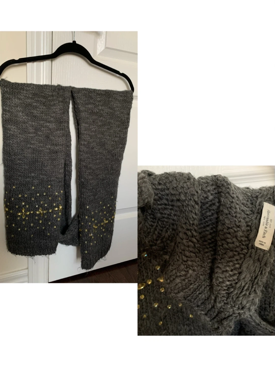 A cozy grey knit scarf from Abercrombie & Fitch! It features a lovely design with gold-toned embellishments. Perfect for adding a touch of warmth and style to your outfit.