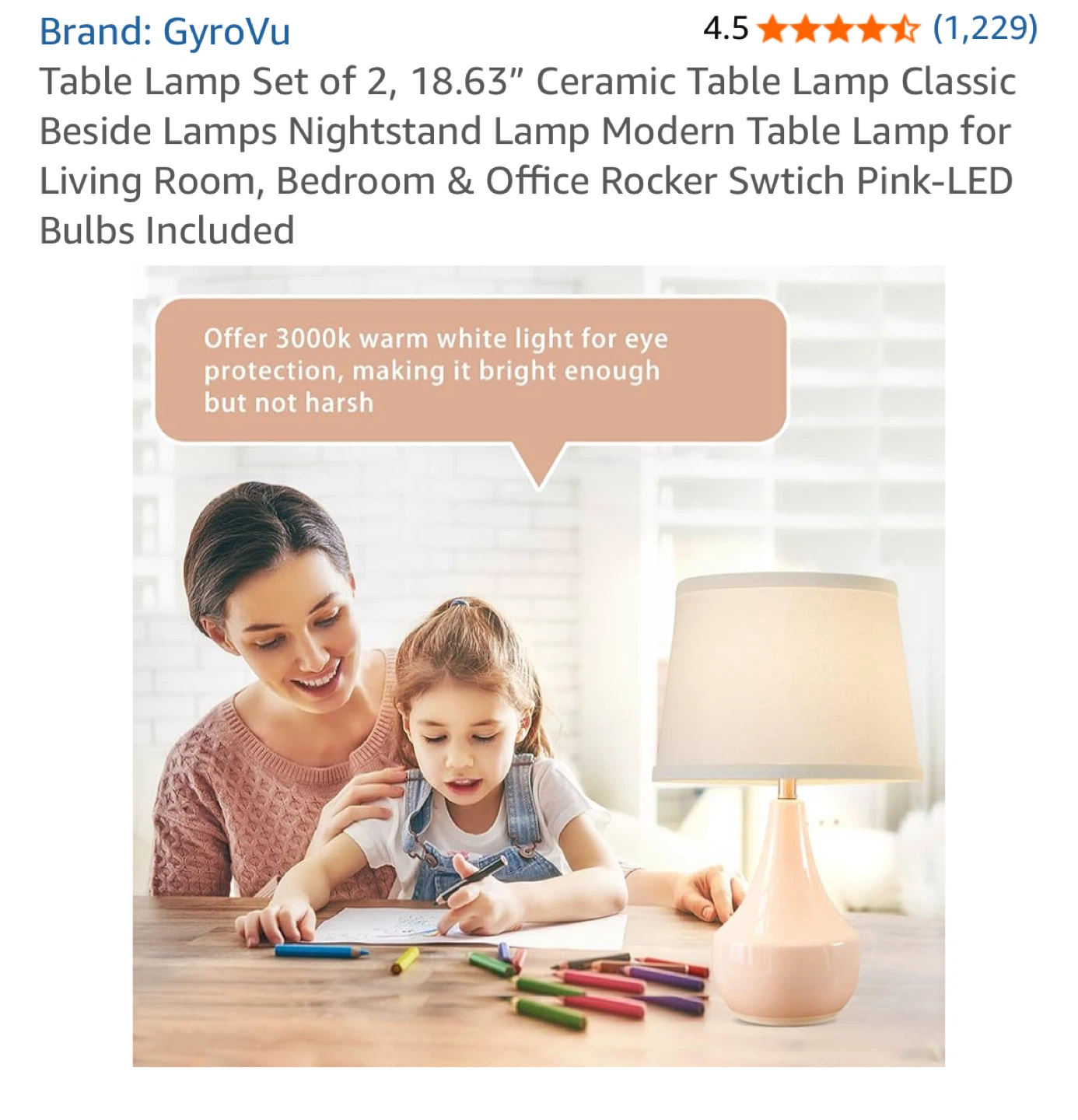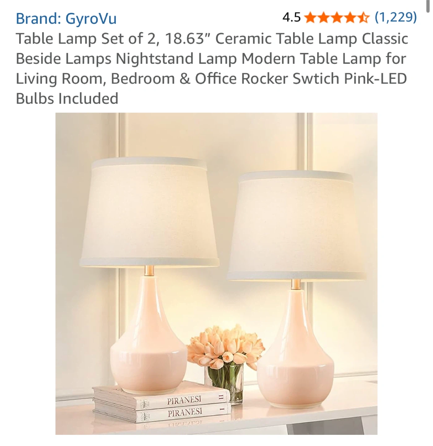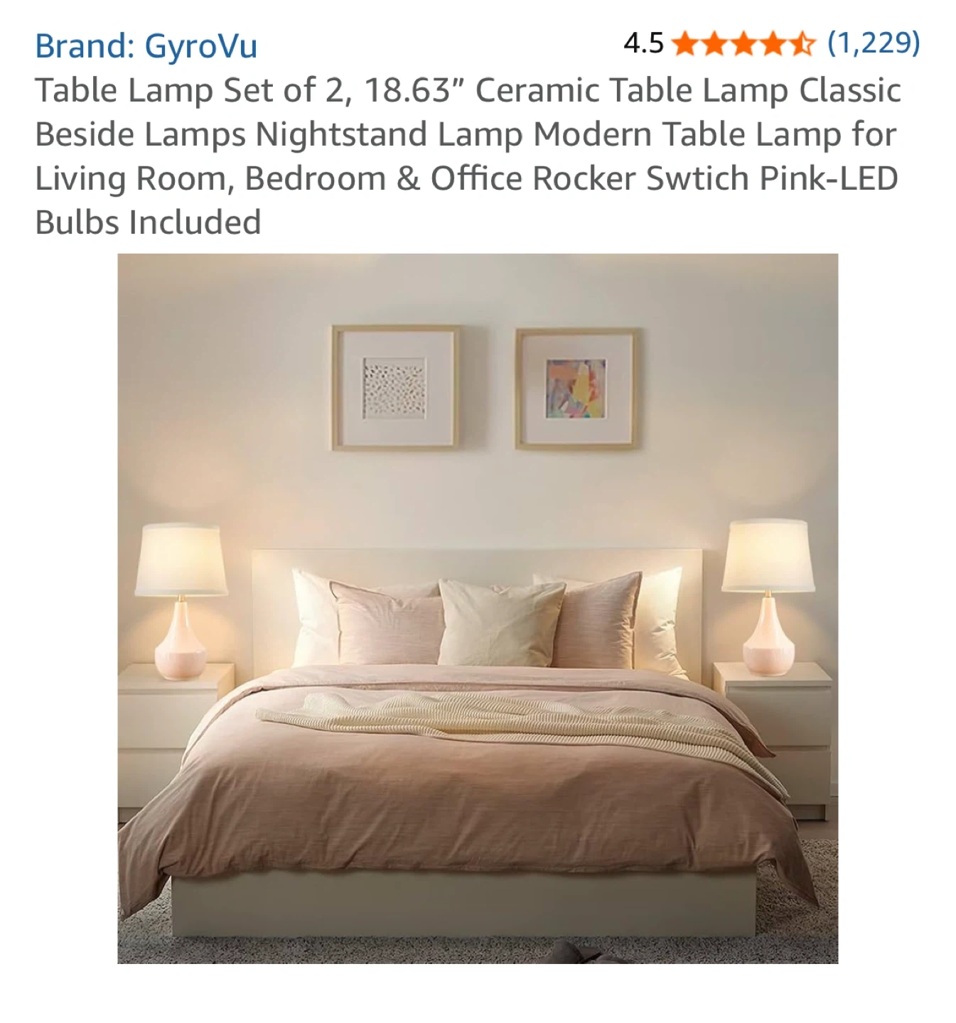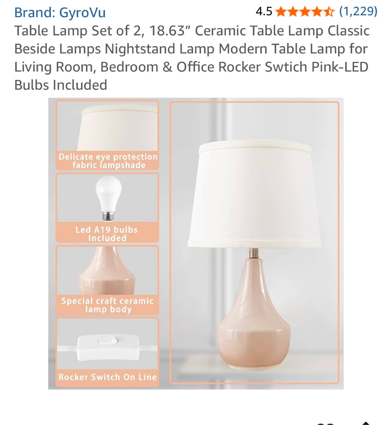 Selling a set of two GyroVu ceramic table lamps. They're perfect for a bedside table, living room, or office. The lamps have a rocker switch and include LED bulbs. They offer 3000k warm white light for eye protection, making it bright enough but not harsh. The lamps are 18.63" tall and 11" wide
