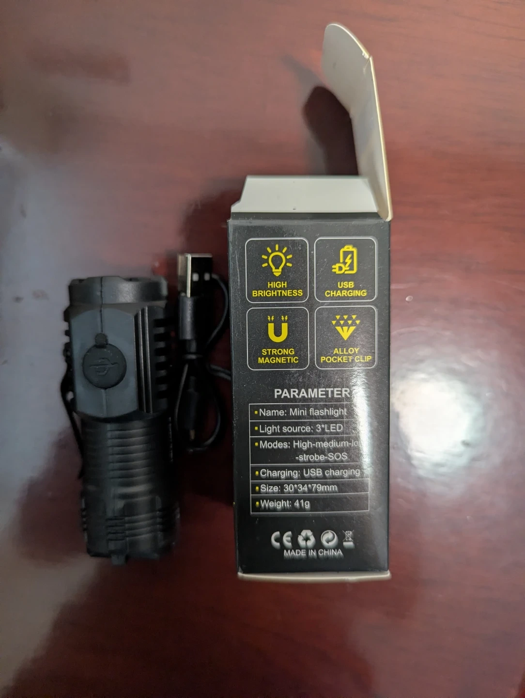 Selling a mini flashlight with 3 LEDs! It has high, medium, low, strobe, and SOS modes. It's USB rechargeable and has a strong magnetic alloy pocket clip. Size is 30*34*79mm and weighs 41g. Comes with the box and USB charging cable