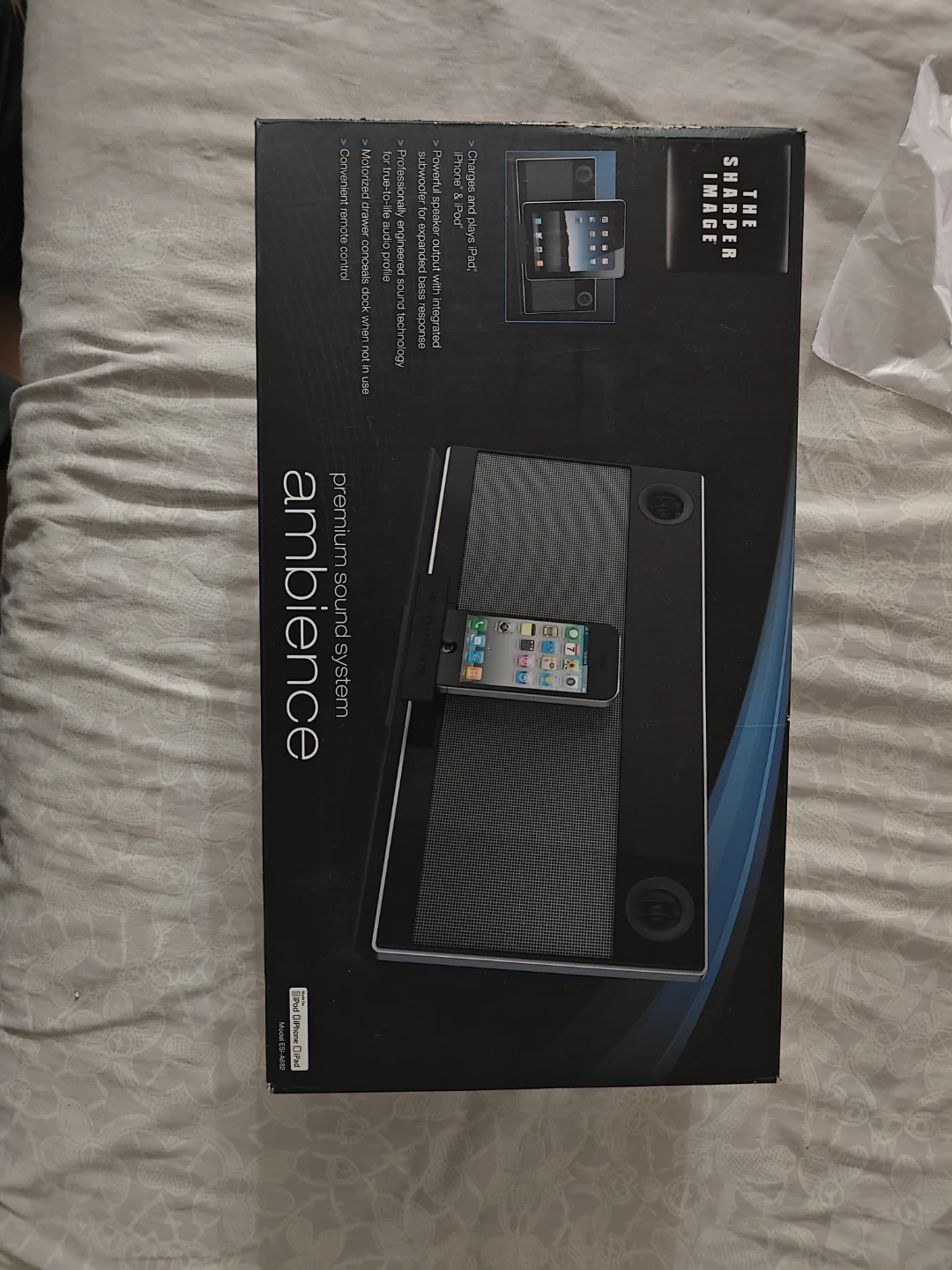 16Selling The Sharper Image Ambience premium sound system! It charges and plays iPad, iPhone & iPod. It has a powerful speaker output with integrated subwoofer for expanded bass response and professionally engineered sound technology for true-to-life audio profile. Also, the motorized drawer conceals dock when not in use and has a convenient remote control