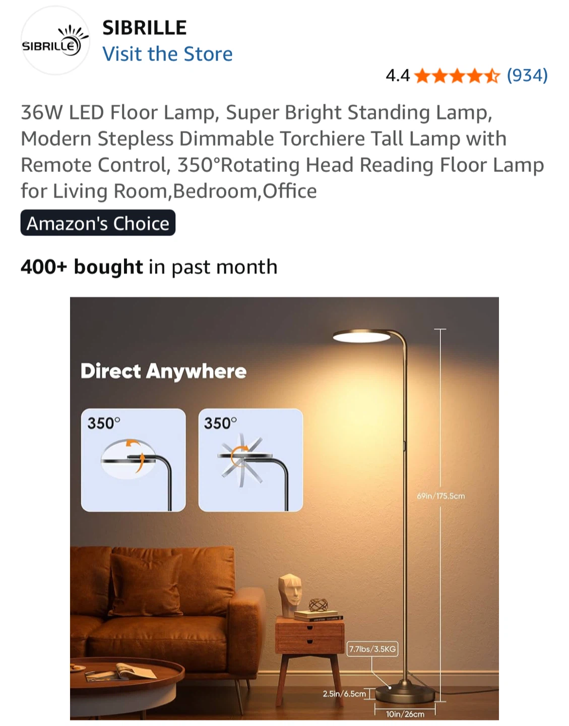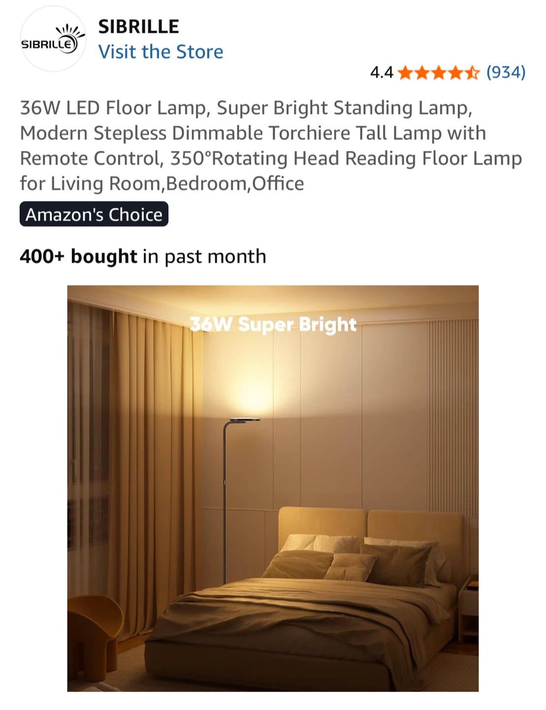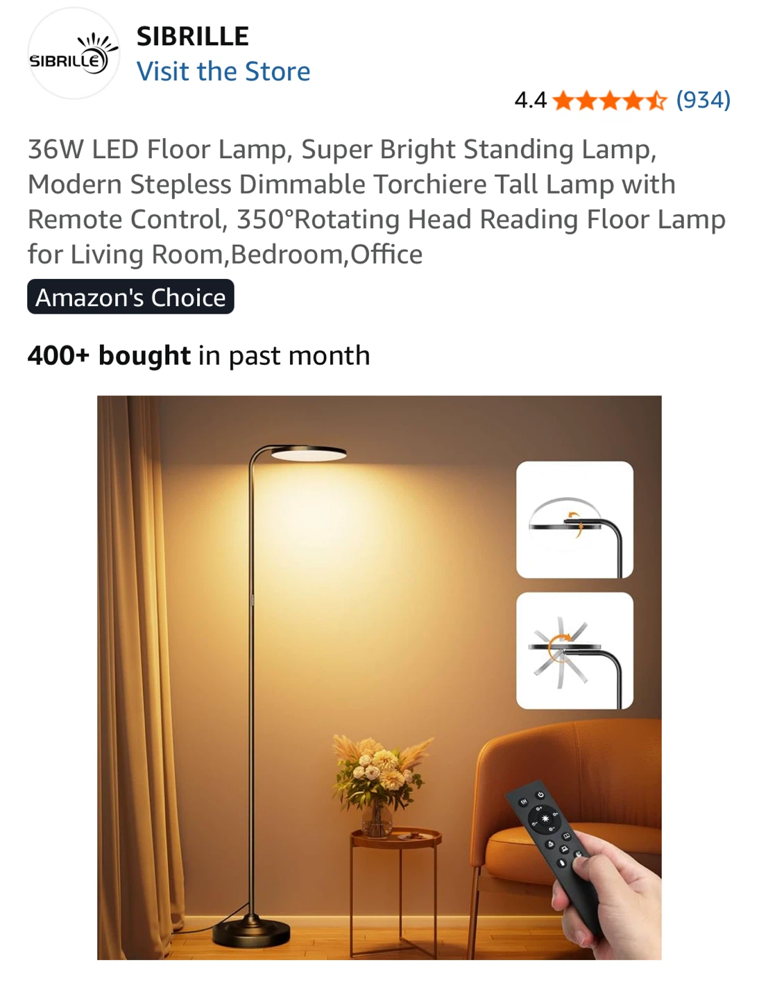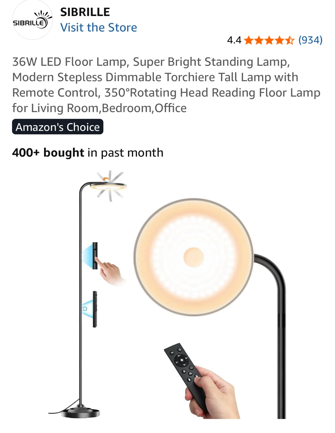 Looking to brighten up your space? I'm selling a Sibrille 36W LED Floor Lamp. It's a super bright standing lamp with a modern, stepless dimmable torchiere design. It also comes with a remote control and a 350° rotating head, perfect for living rooms, bedrooms, or offices
