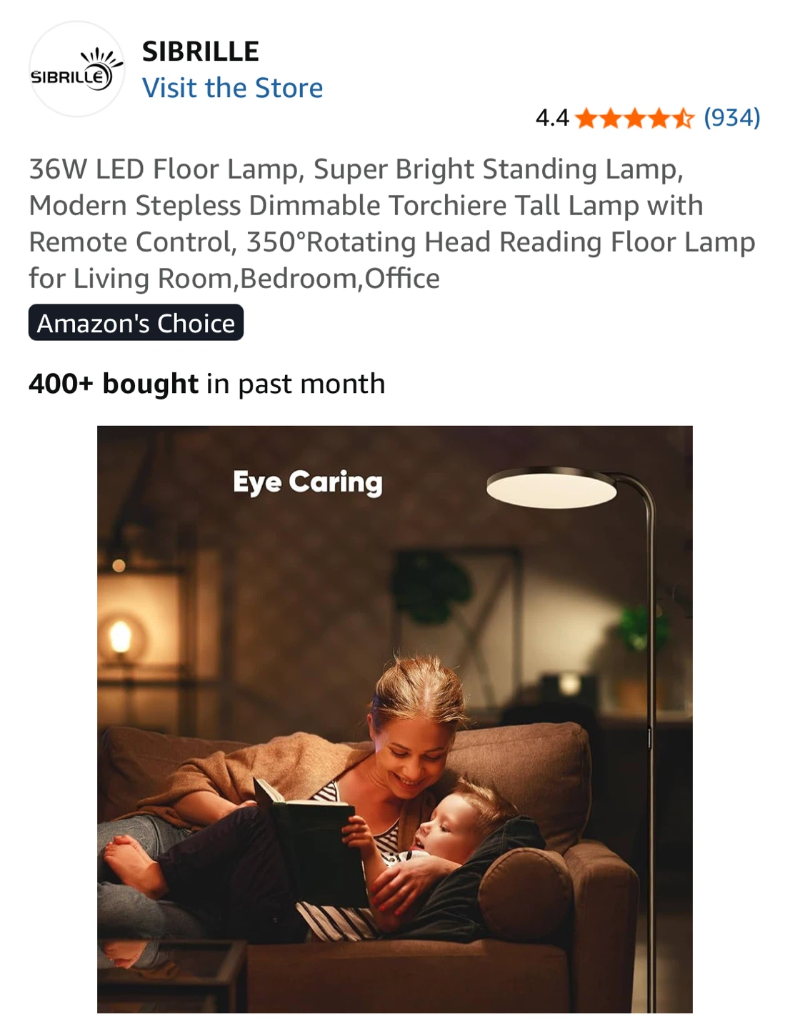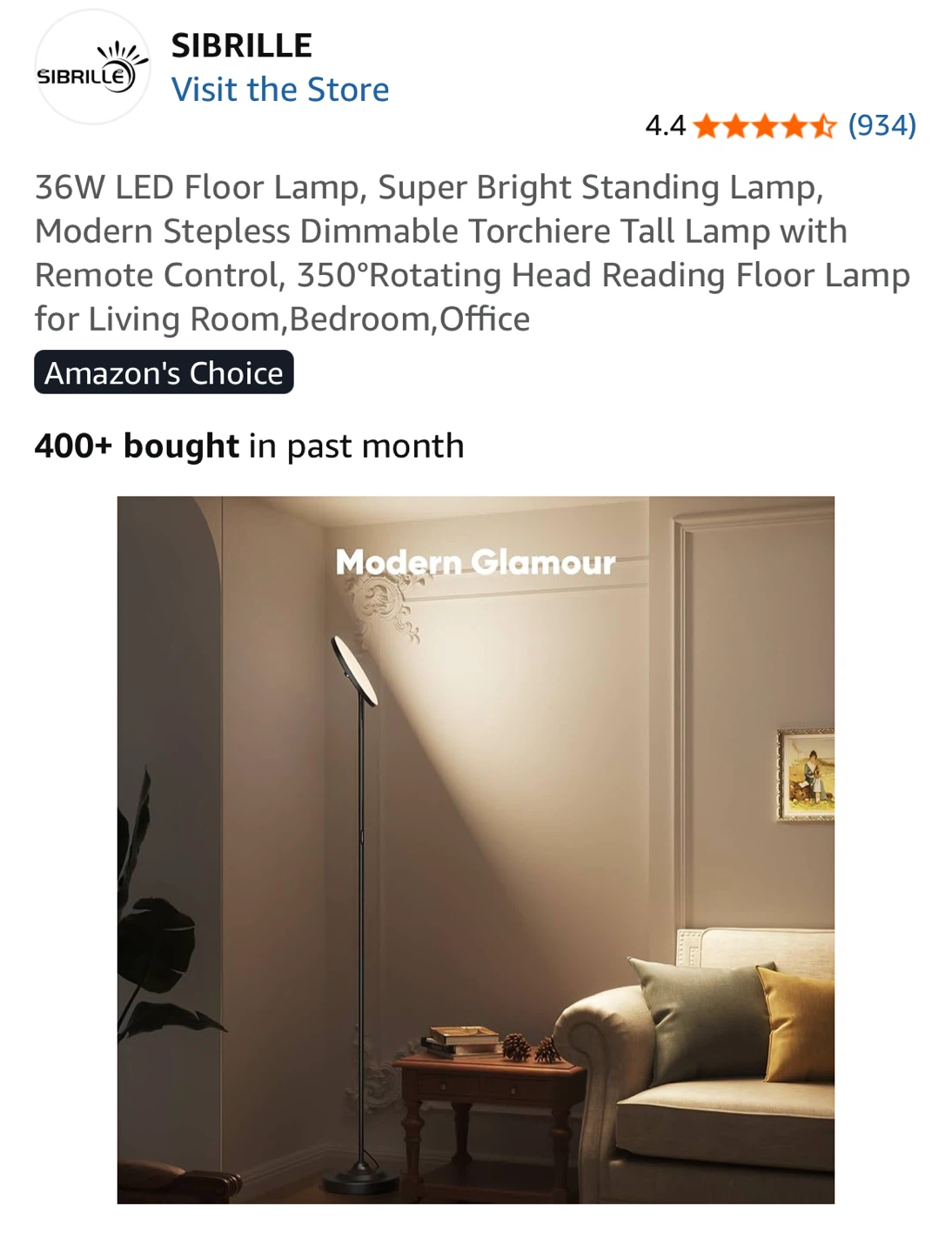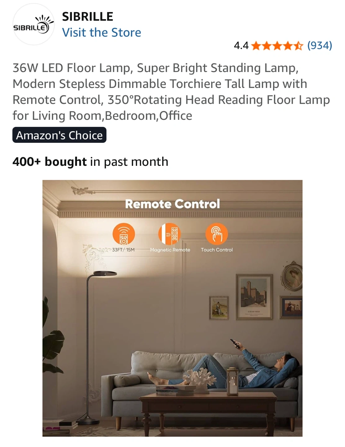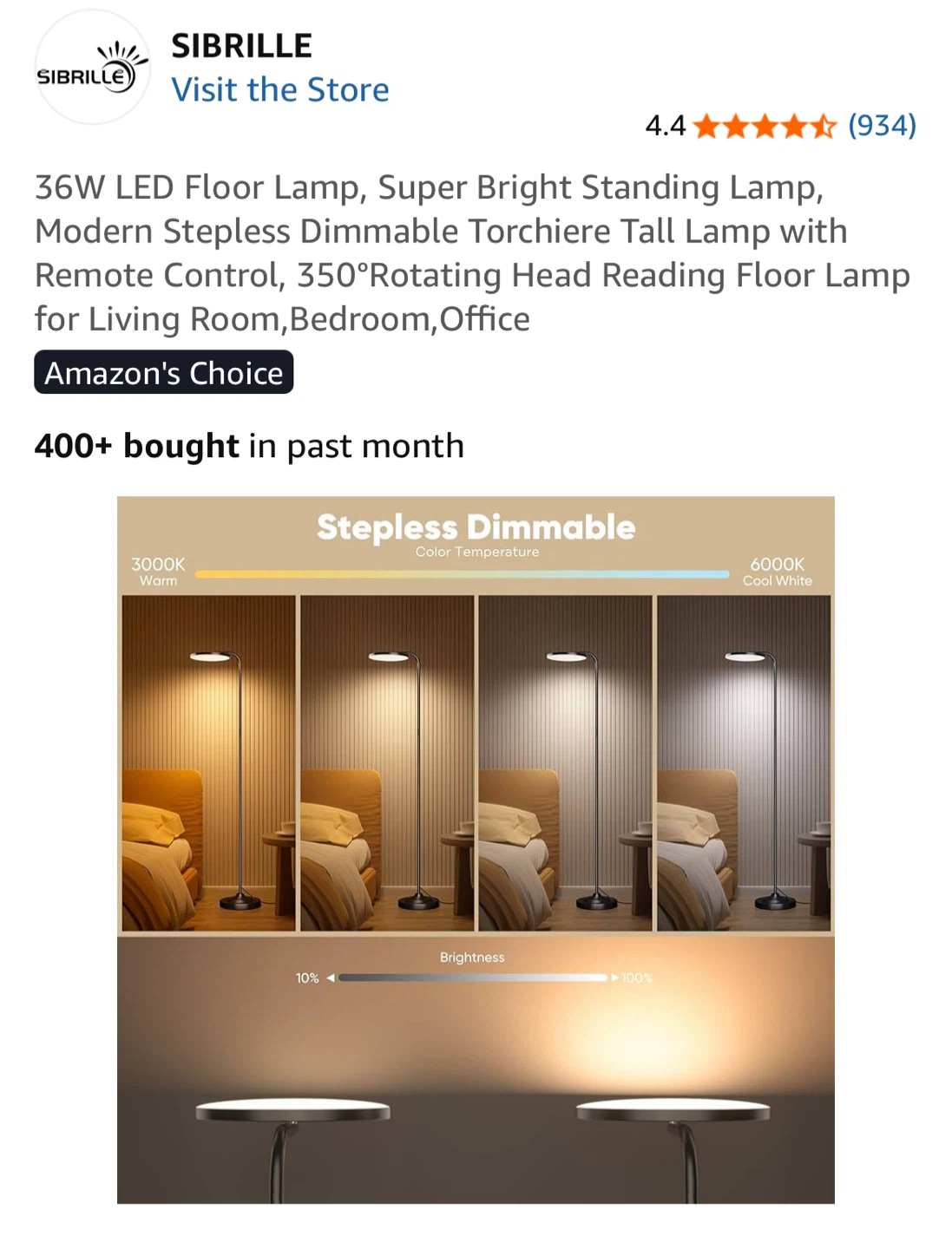 Looking to brighten up your space? I'm selling a Sibrille 36W LED Floor Lamp. It's a super bright standing lamp with a modern, stepless dimmable torchiere design. It also comes with a remote control and a 350° rotating head, perfect for living rooms, bedrooms, or offices