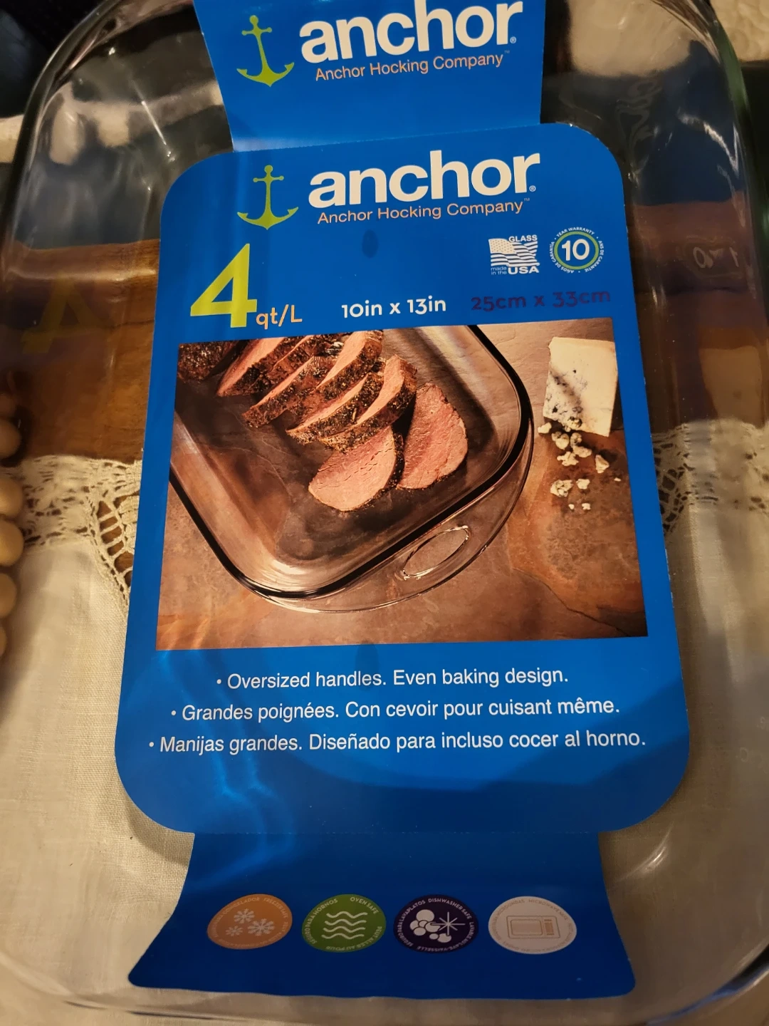 70I'm selling a brand new Anchor Hocking glass baking dish! It's a 4 qt/L size, measuring 10in x 13in (25cm x 33cm). It features oversized handles and an even baking design. Perfect for all your baking needs! All Sales Final. No returns. Cash only please. Thanks.