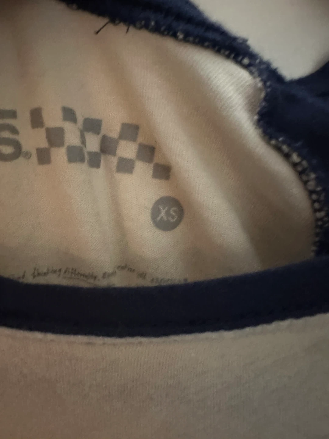 Selling a Vans raglan long sleeve shirt in size XS. It's a cream colour with navy blue sleeves. Perfect for layering or wearing on its own!