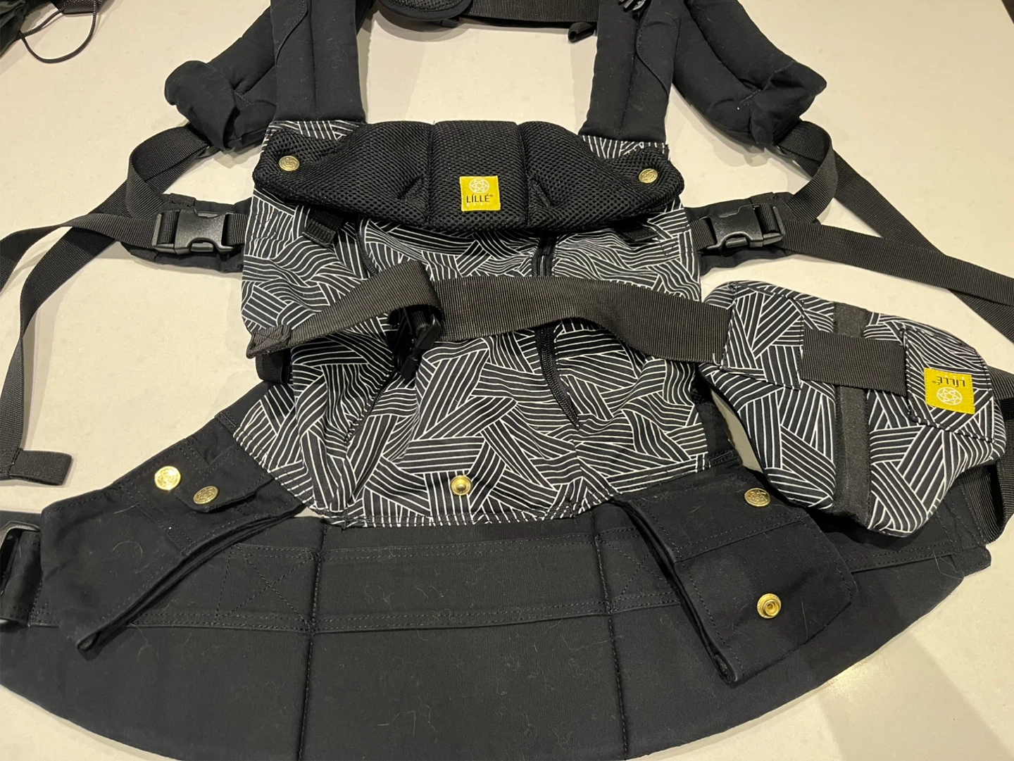 This is a LILLEbaby Complete 6-in-1 All Seasons baby carrier in excellent condition. It features a stylish black and white design. It supports 6 different carrying positions to suit your and your baby's needs. Perfect for keeping your little one close and comfortable while you're on the go! Can be used from 7-45 lbs.
