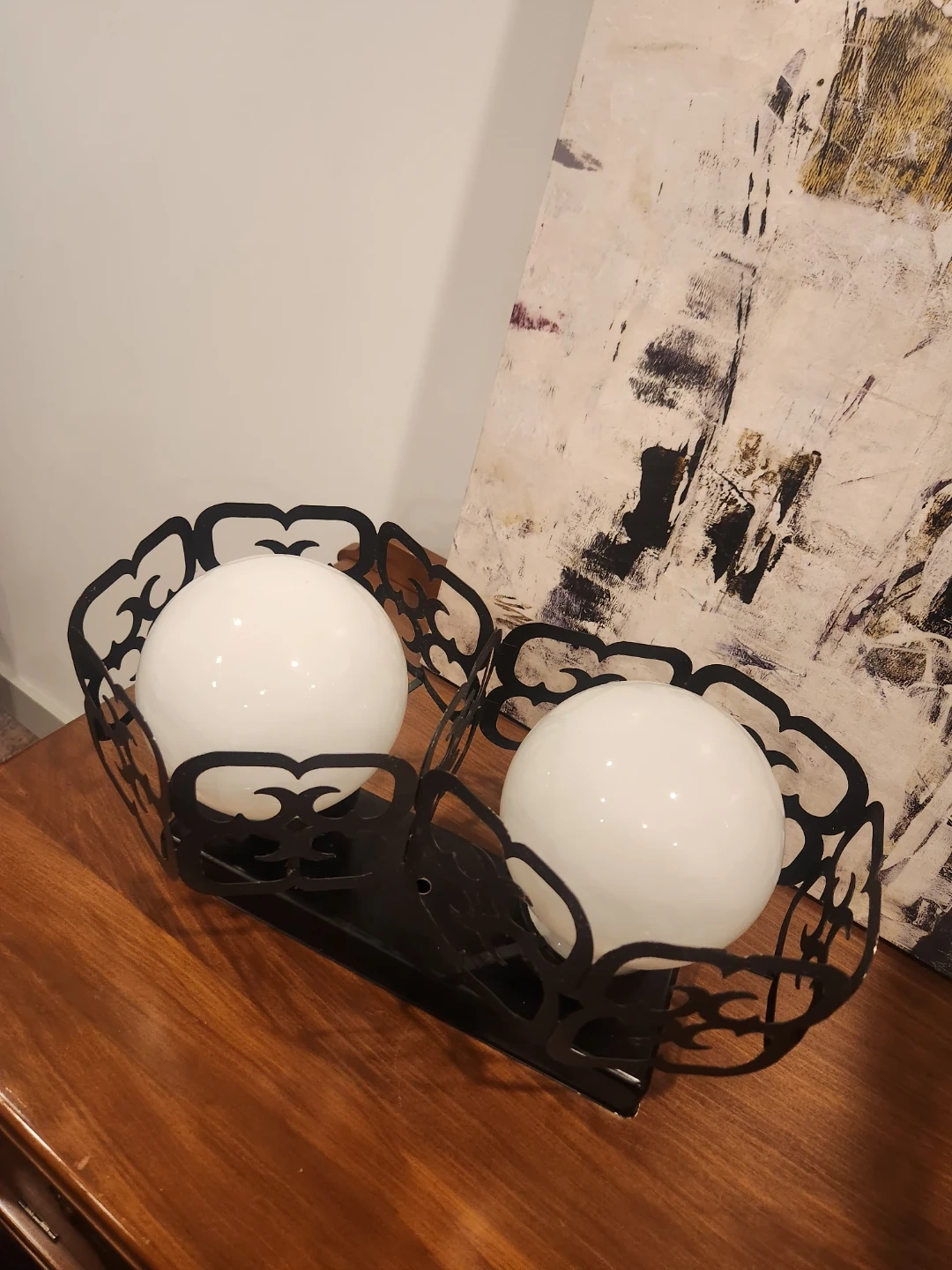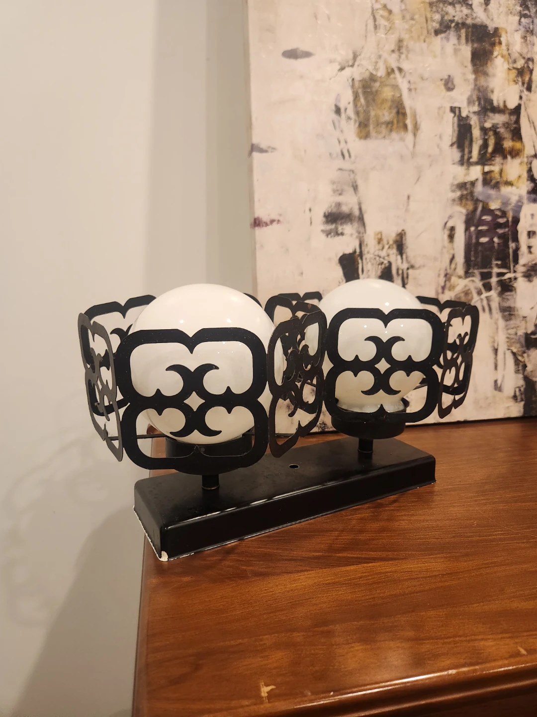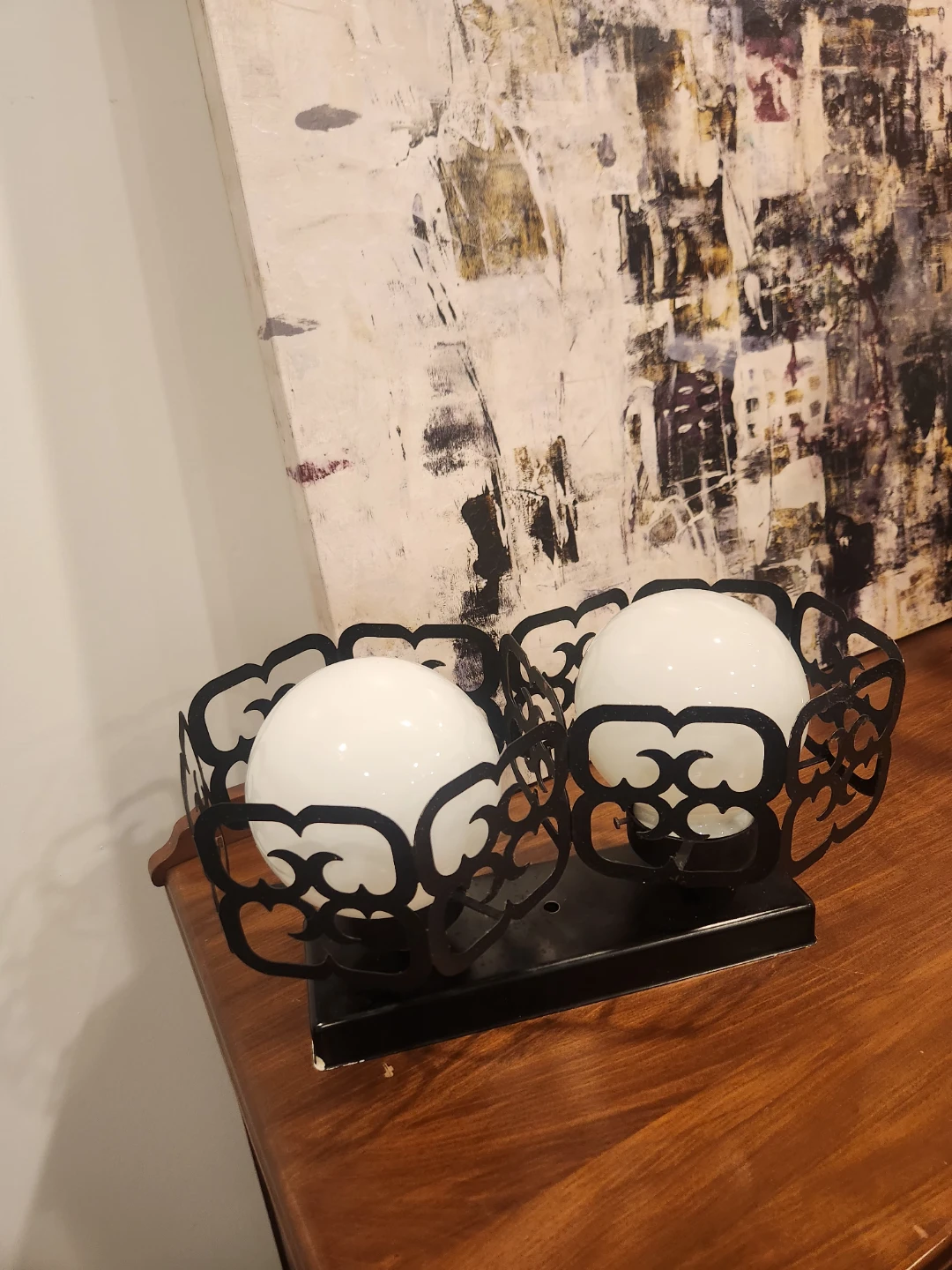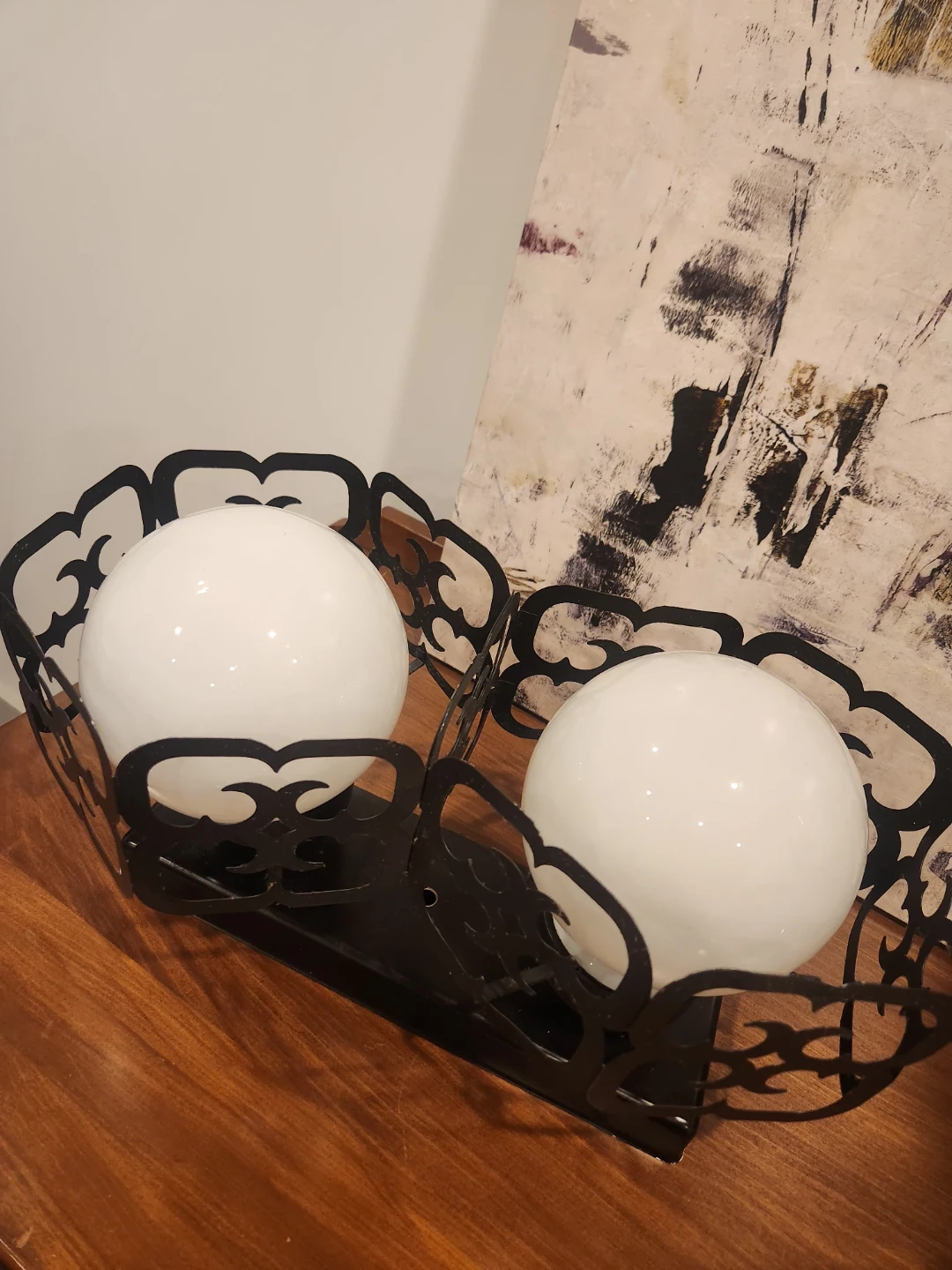 RARE UNDERWRITERS LABRATORIES INC. Brand fixtures! 1950's double globe wall or ceiling fixture! It features two white globes held in a black scrolled metal frame. 17 Inches long x 7 inches wide 8 incges high including base.