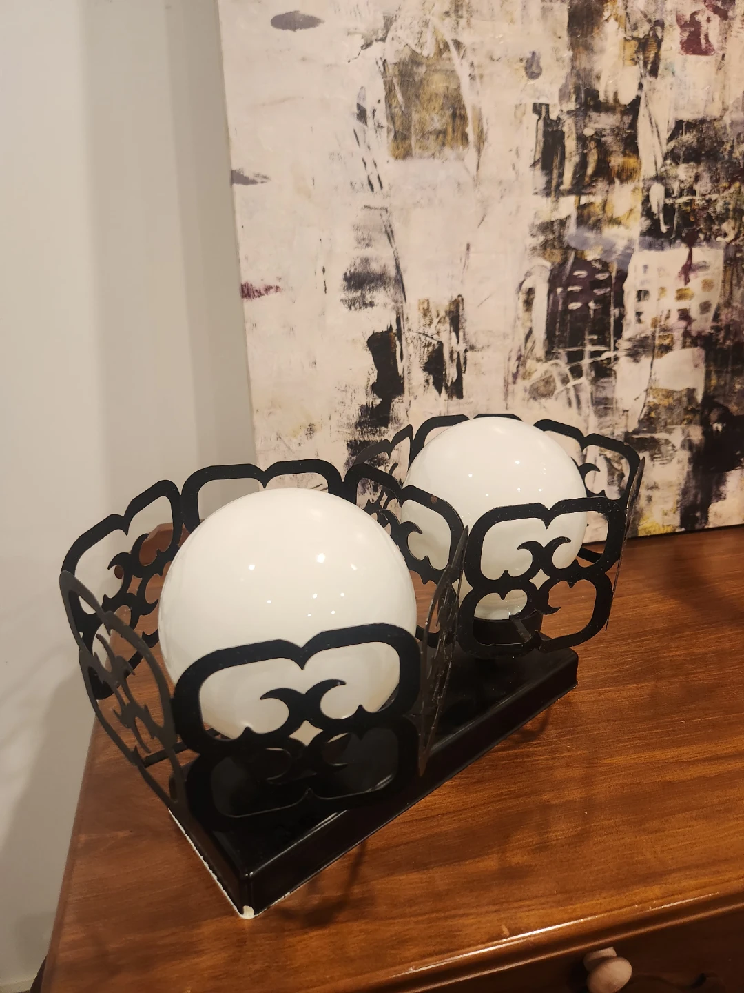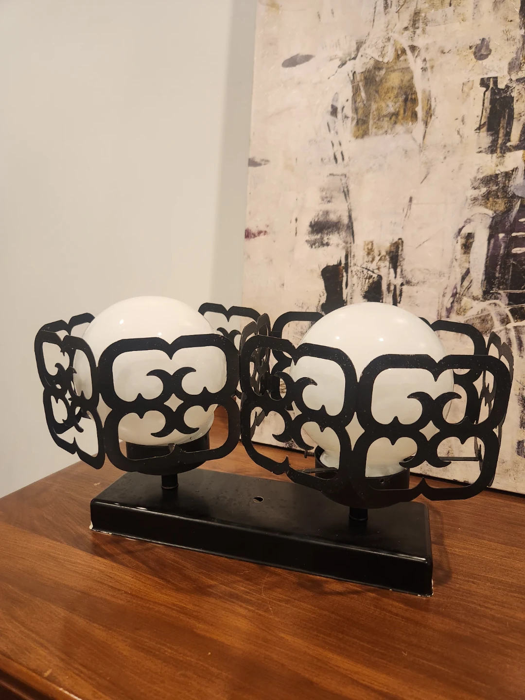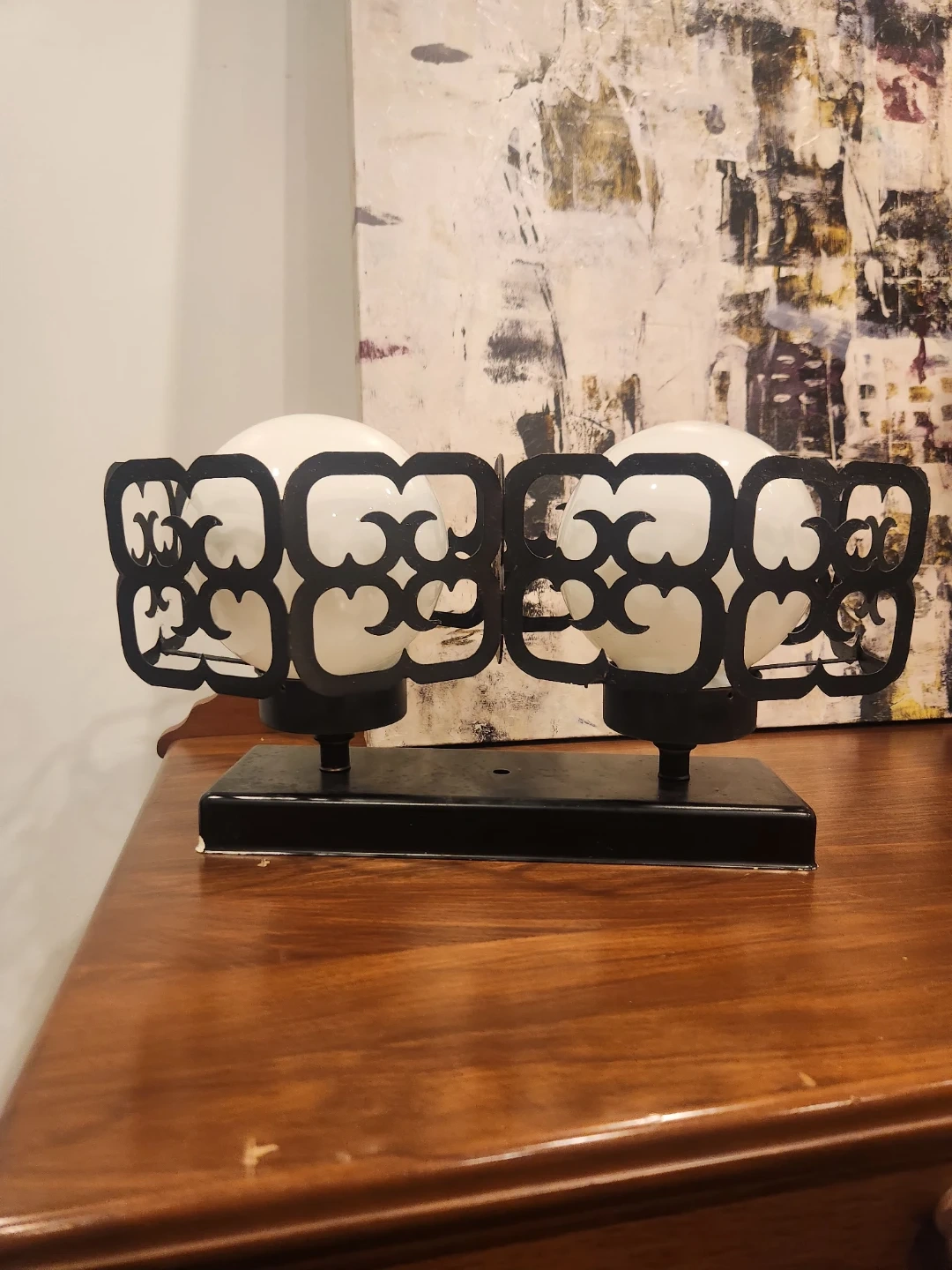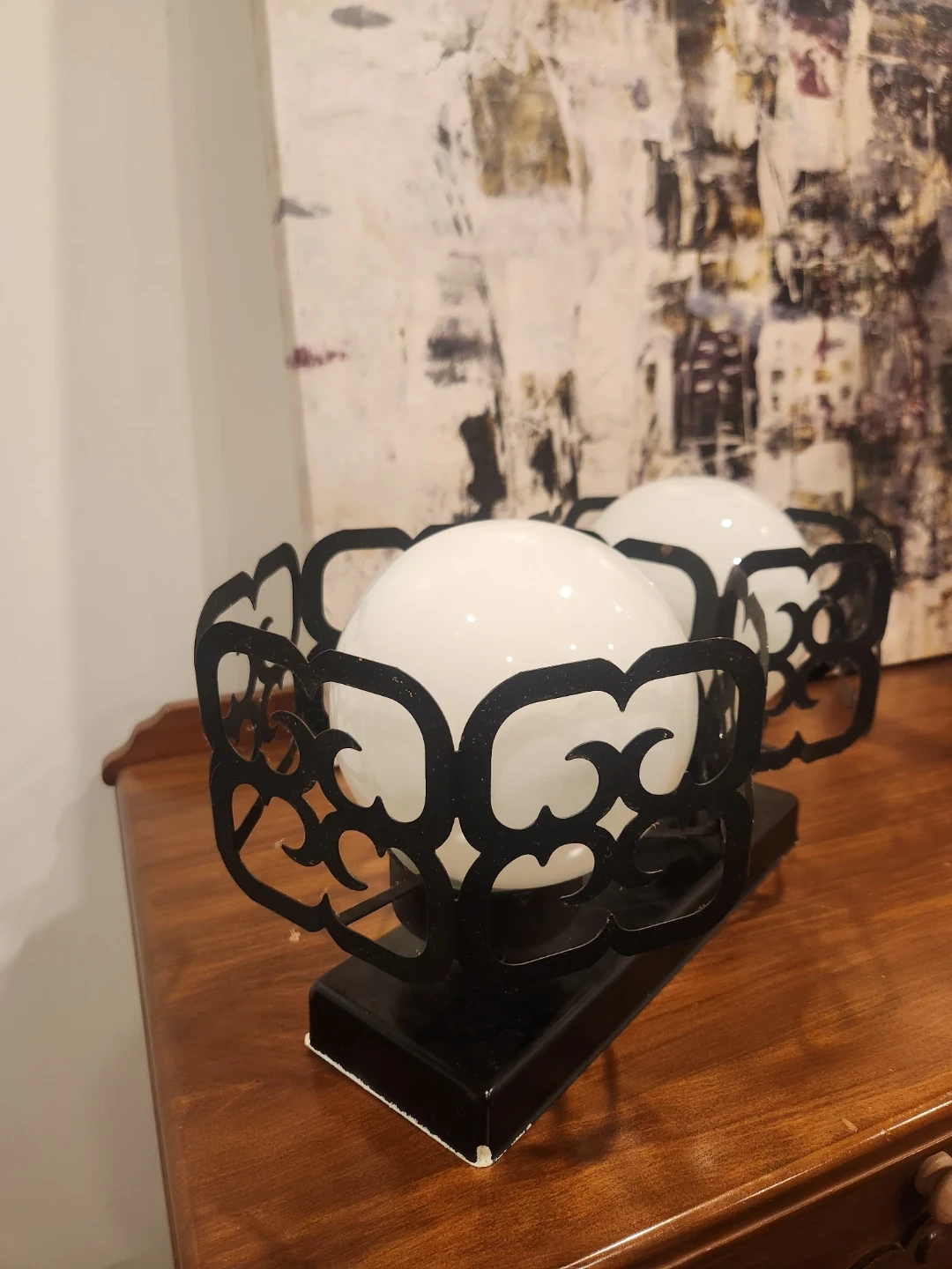 RARE UNDERWRITERS LABRATORIES INC. Brand fixtures! 1950's double globe wall or ceiling fixture! It features two white globes held in a black scrolled metal frame. 17 Inches long x 7 inches wide 8 incges high including base.