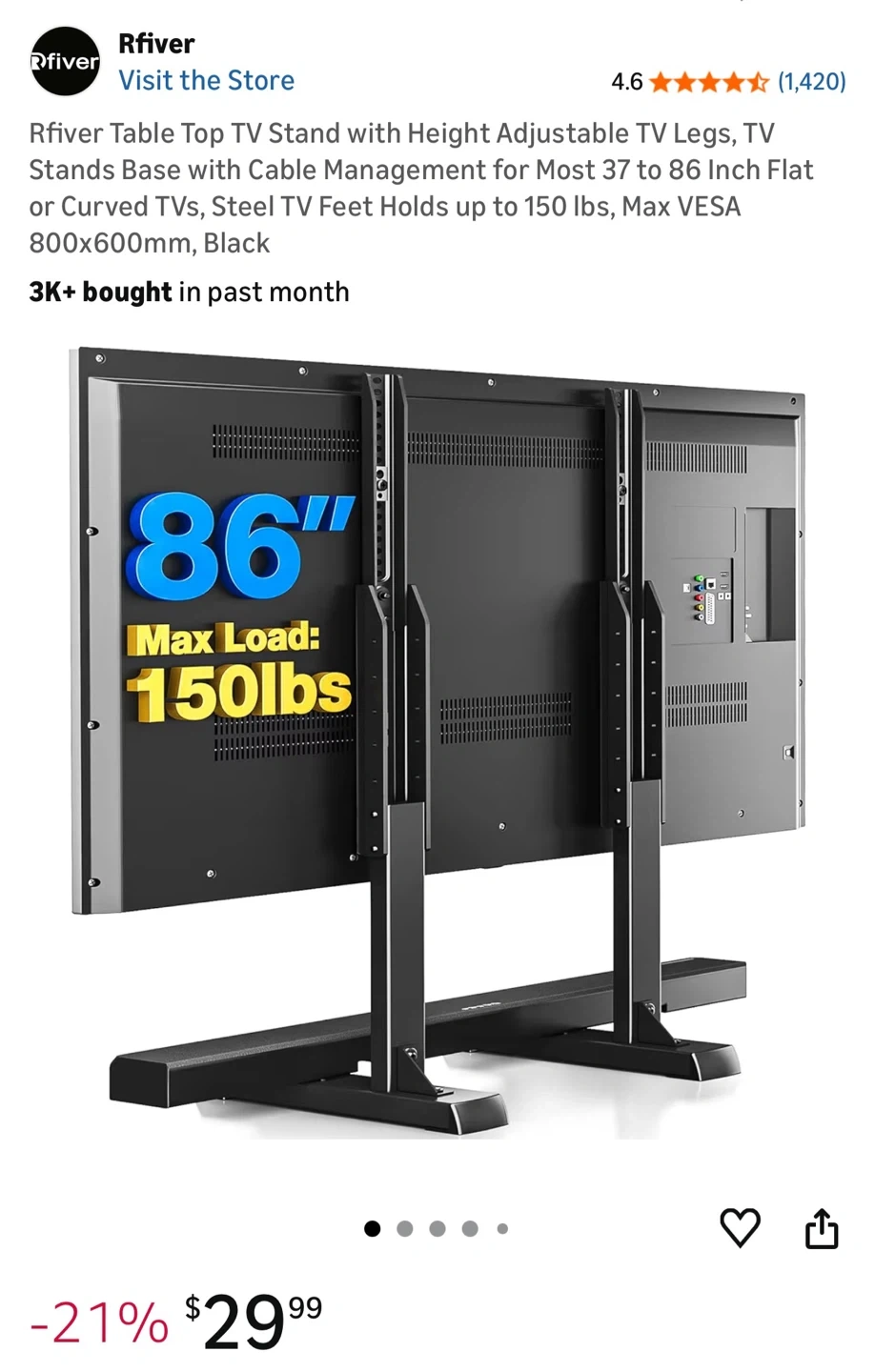 Selling a Rfiver Table Top TV Stand, perfect for TVs ranging from 37 to 86 inches! It comes with height-adjustable TV legs and a cable management system. The steel TV feet can hold up to 150 lbs and support Max VESA 800x600mm. It's in its original box, ready for a new home